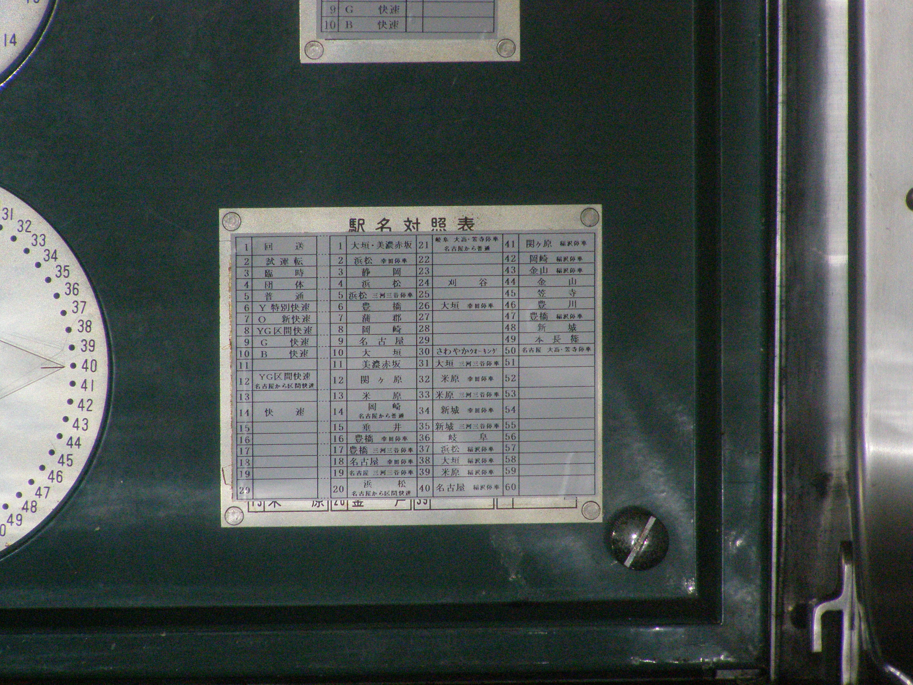 名古屋駅にてホーム上から。すでに回送で停車していたため、車内からの撮影性は確認できず。 既に117系の運用がほとんどない状況なので、ある意味貴重なショット。 ちなみに種別対照表はまた別途にあるのですが、行先対照表に種別分も載ってるので割愛。
