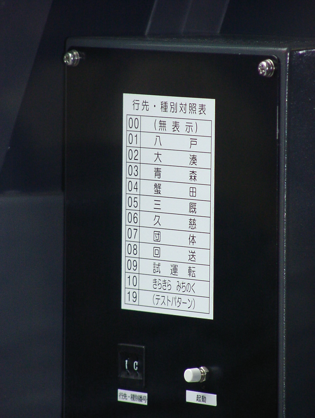 品川駅で展示されていたものを撮影したもの。運転台助士側側壁にある設定機にそのまま貼ってあります。 角度は車内から普通に望遠でOKです。貼付位置的には車外からも撮影できそうな場所にありますが、 運転台位置が結構高いため、難しいと思われます。