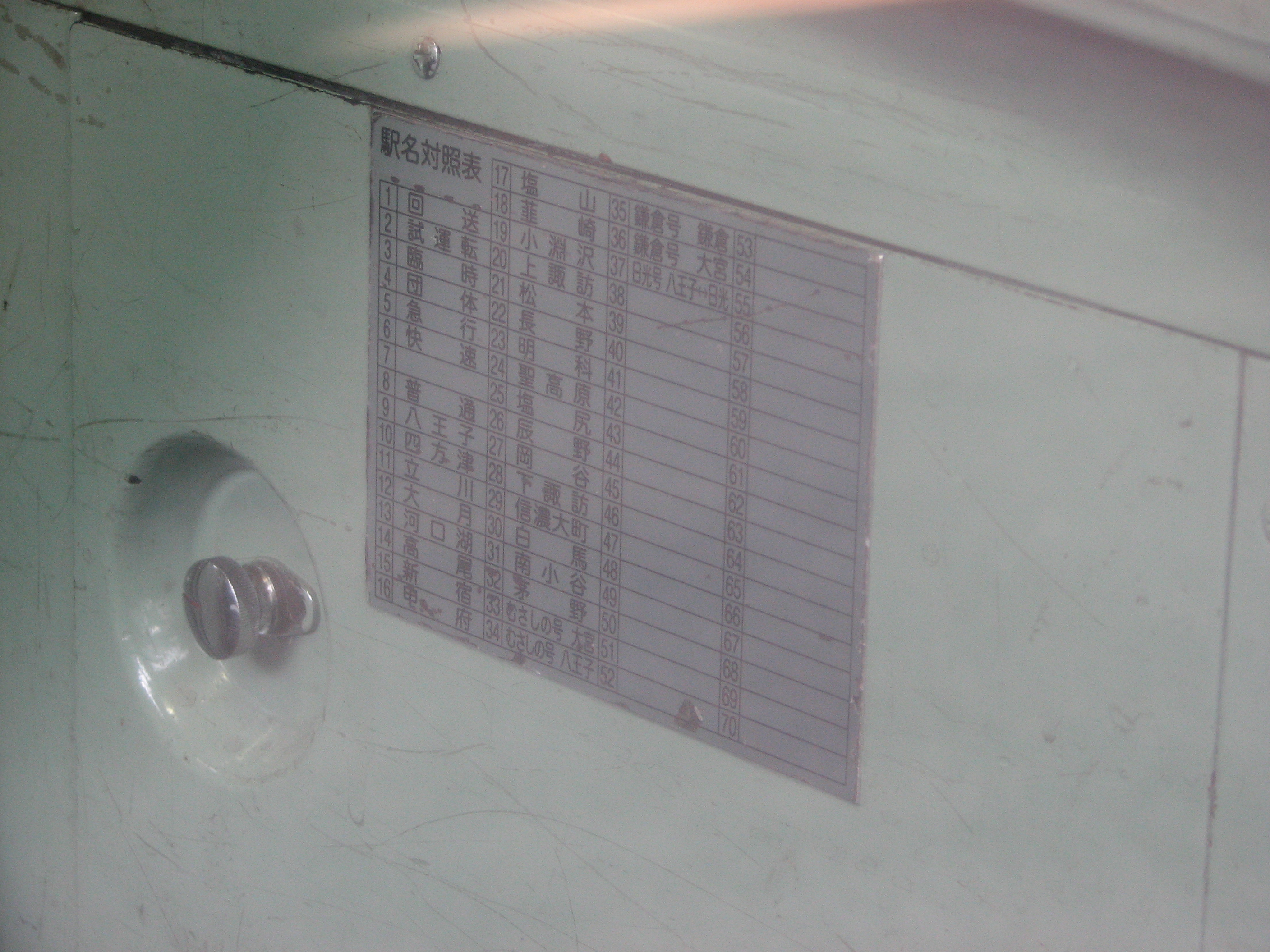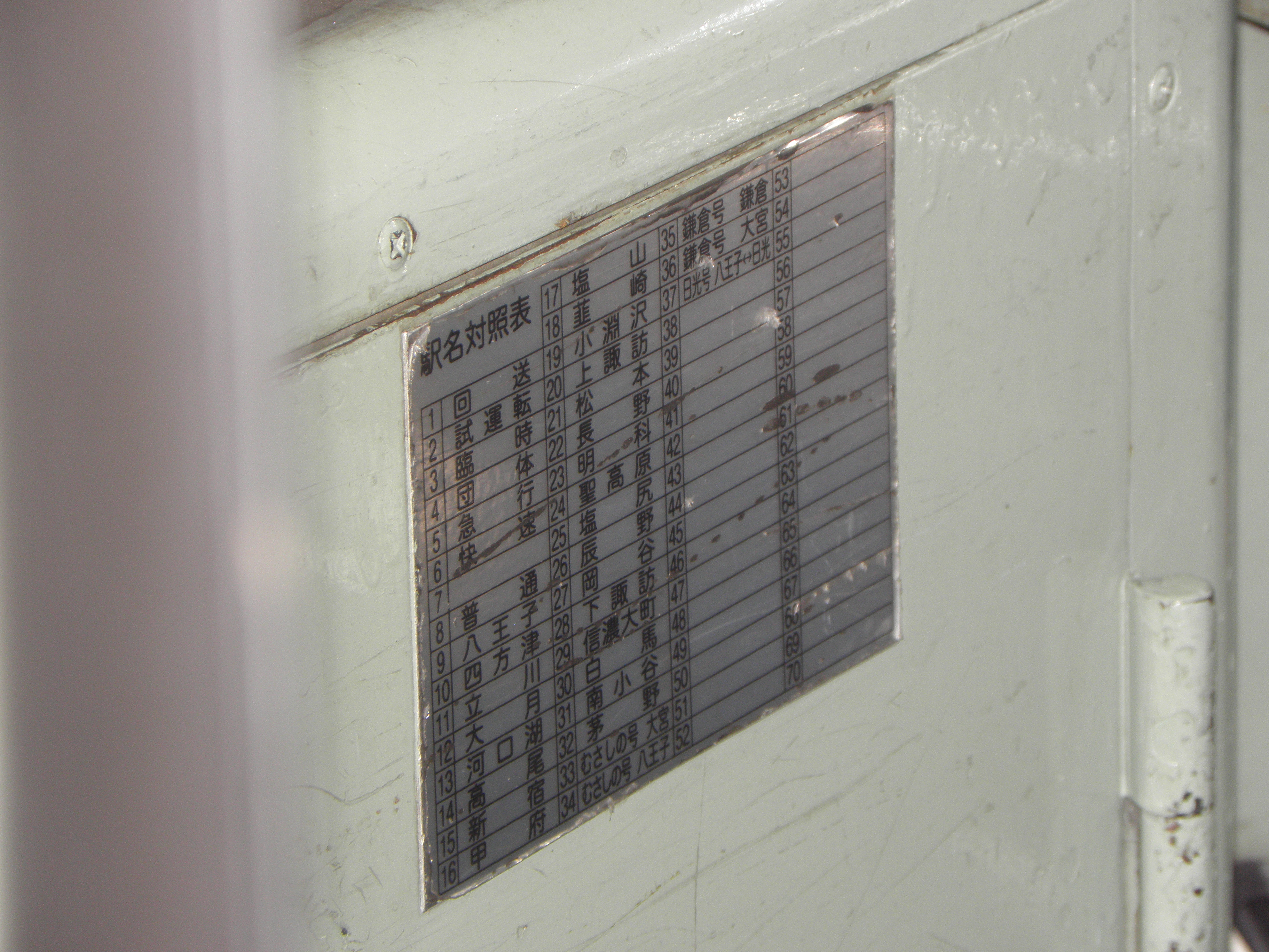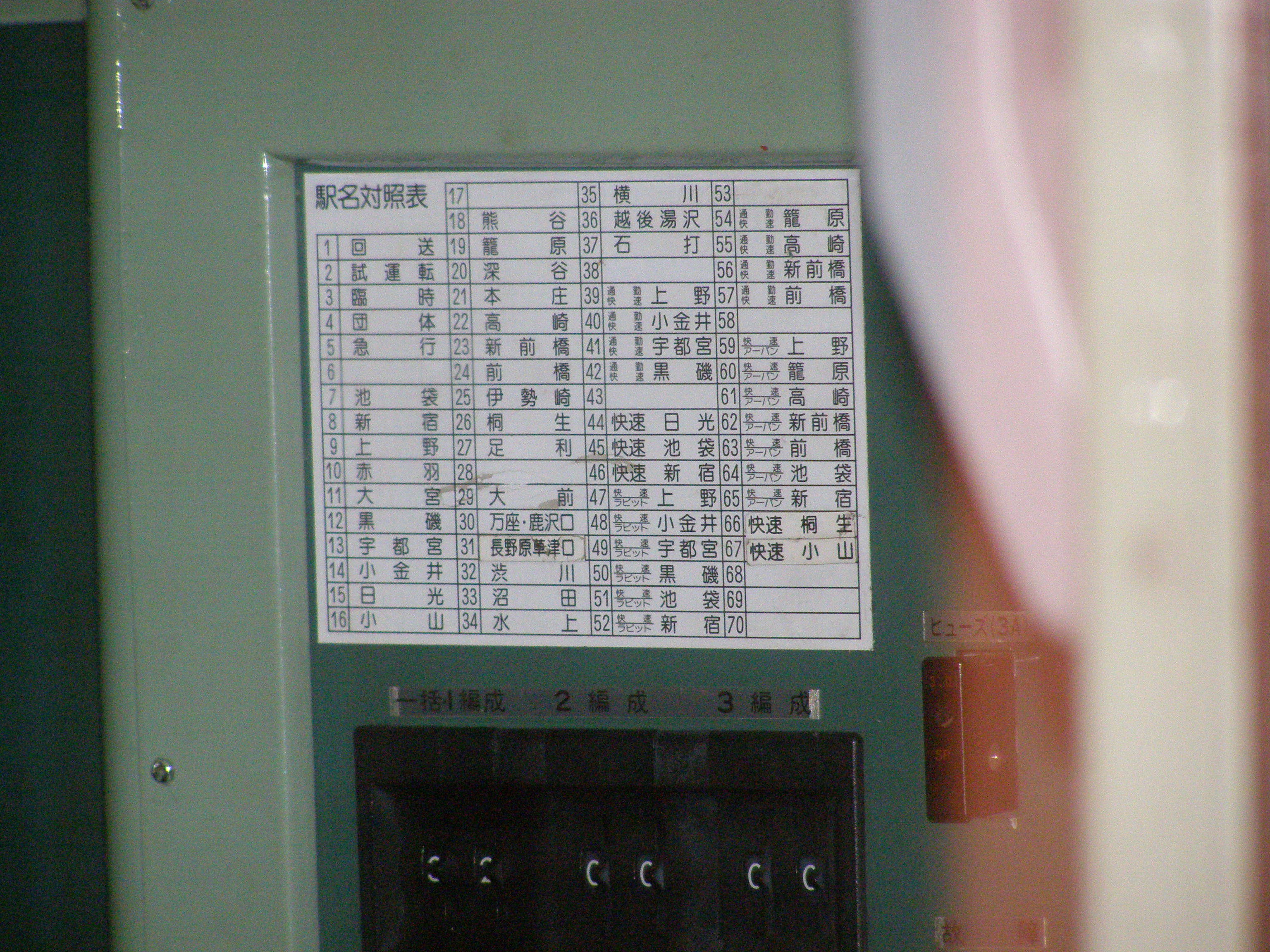 高尾で撮影。設定機の下部、すなわち国府津113系と同位置に貼付。 対照表自体は小ぶりなので、照明の暗さがネックになるものと思われます。