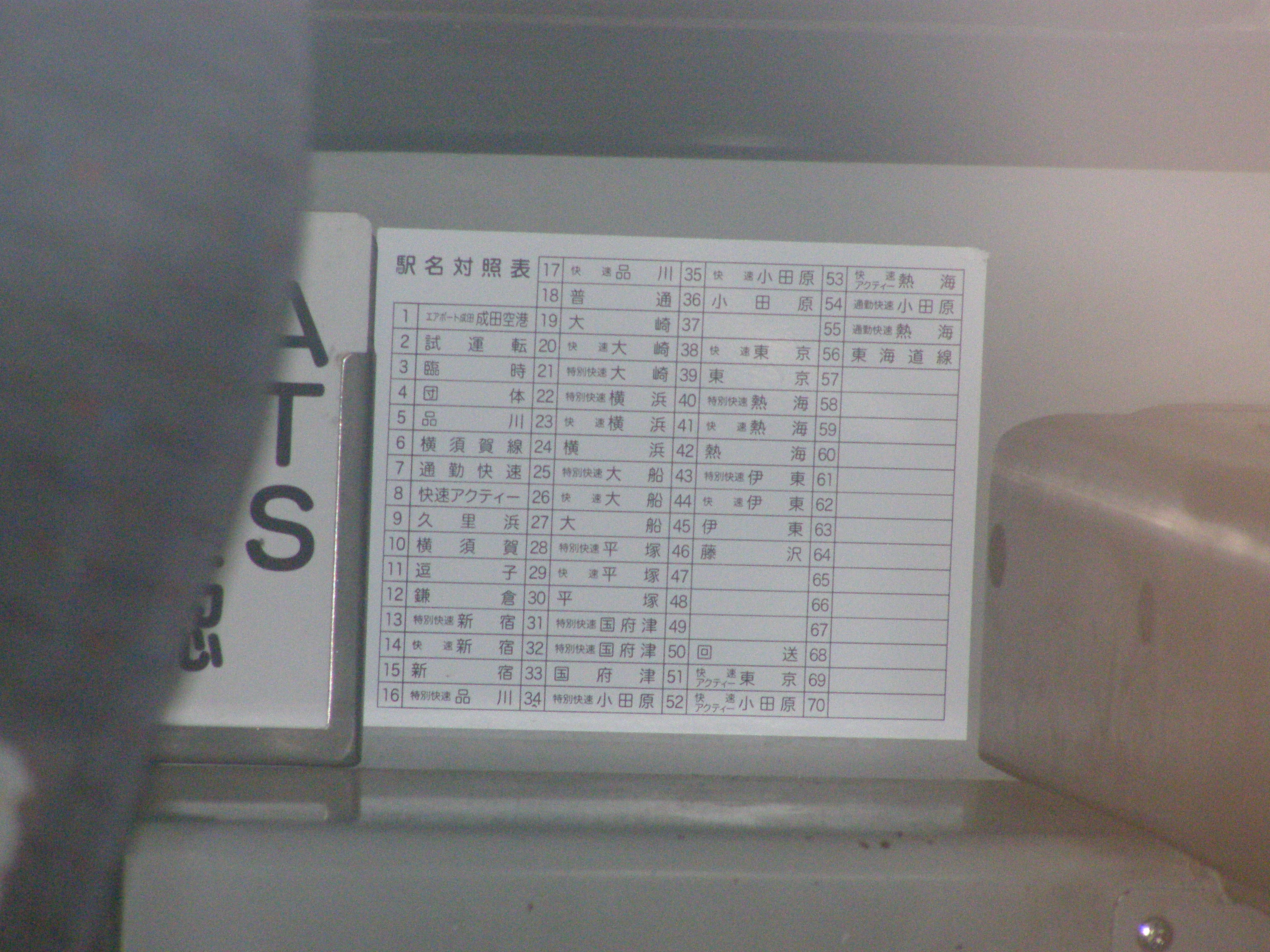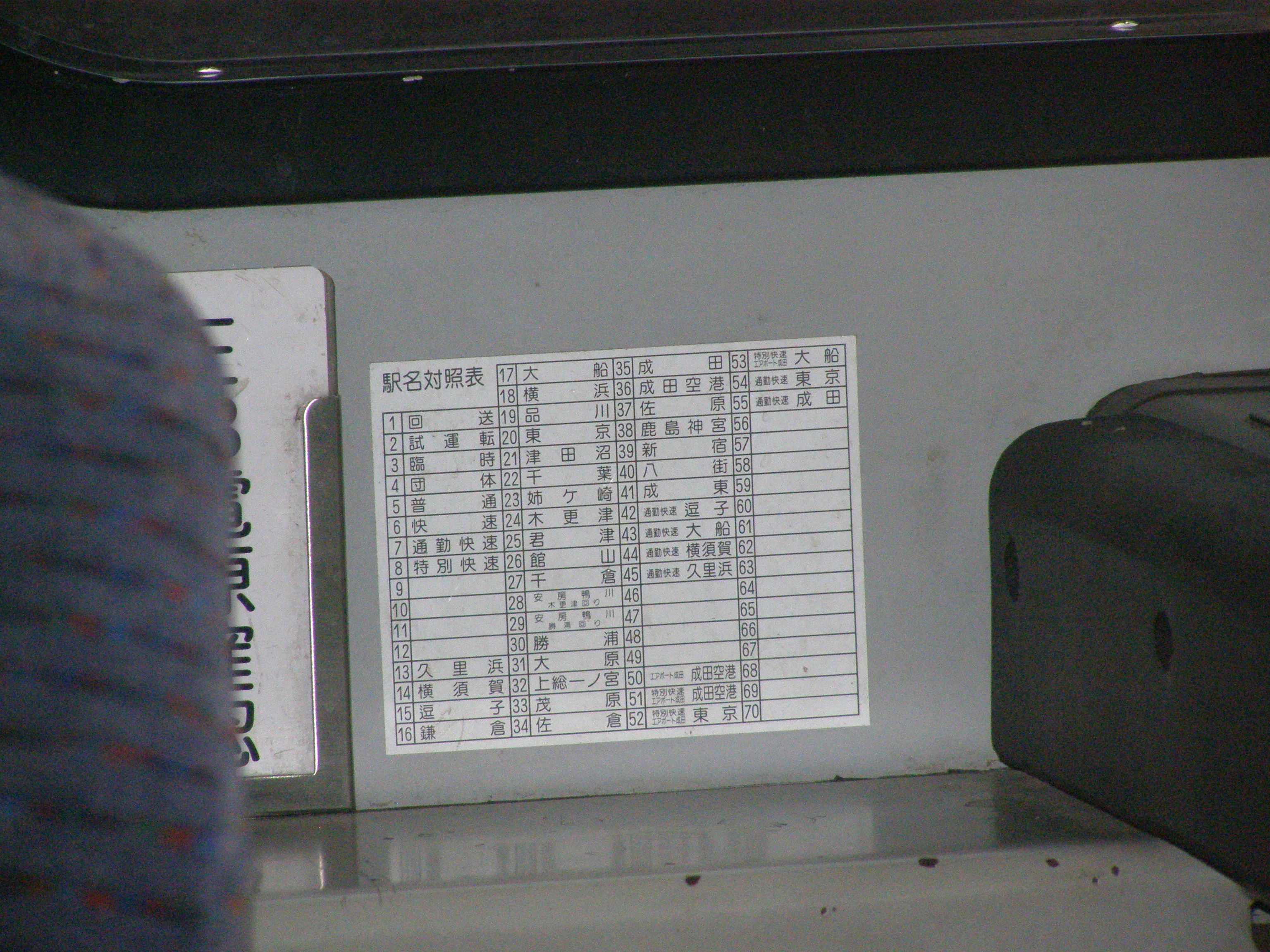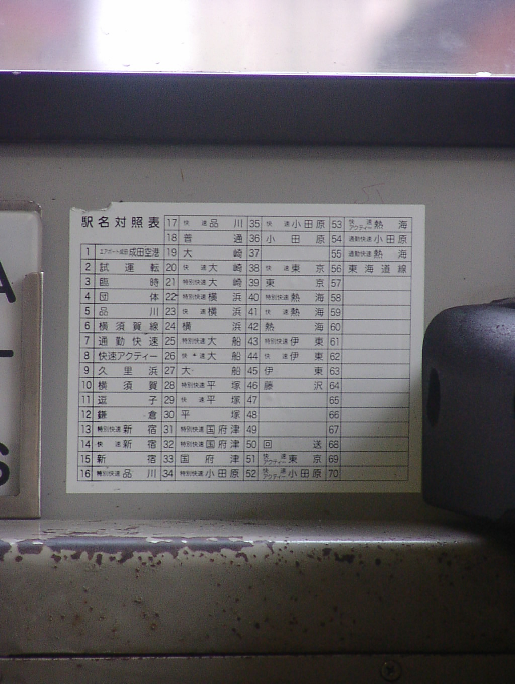 E217系は、サロ216系の山側乗務員室にある制御機下方とクハ運転台側窓下の壁に貼付されています。 なお、サロ216の対照表はすでに更新されておらず、機能しておりません。