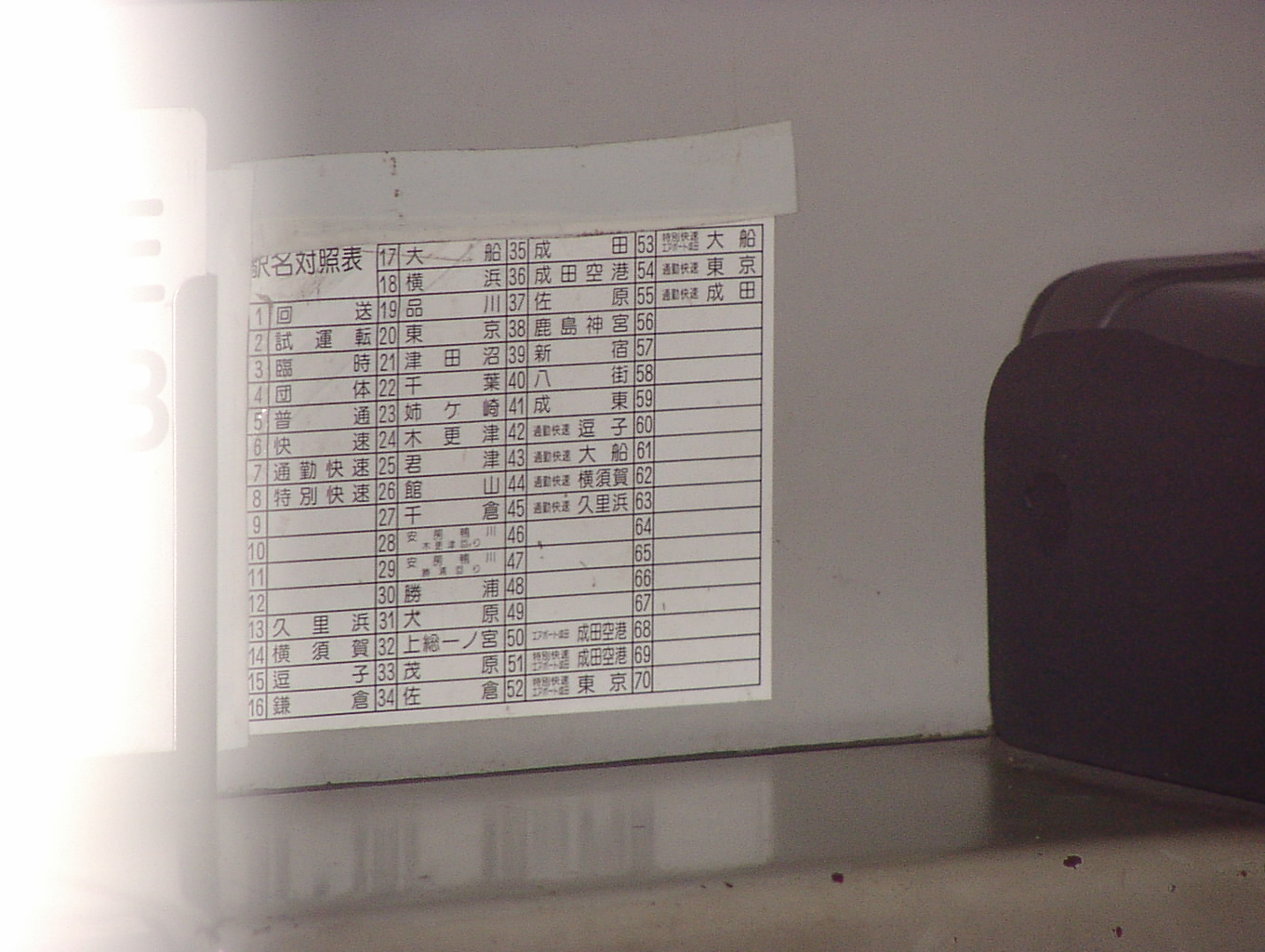 文字がかなり小さいため、助士側からの撮影は10倍ズームでもかなり難しいでしょう。 高画素機で何とかというレベルでしょうか。車内からだと運転士用椅子の影になるため、 着席状態の角度でないとキツイです。
