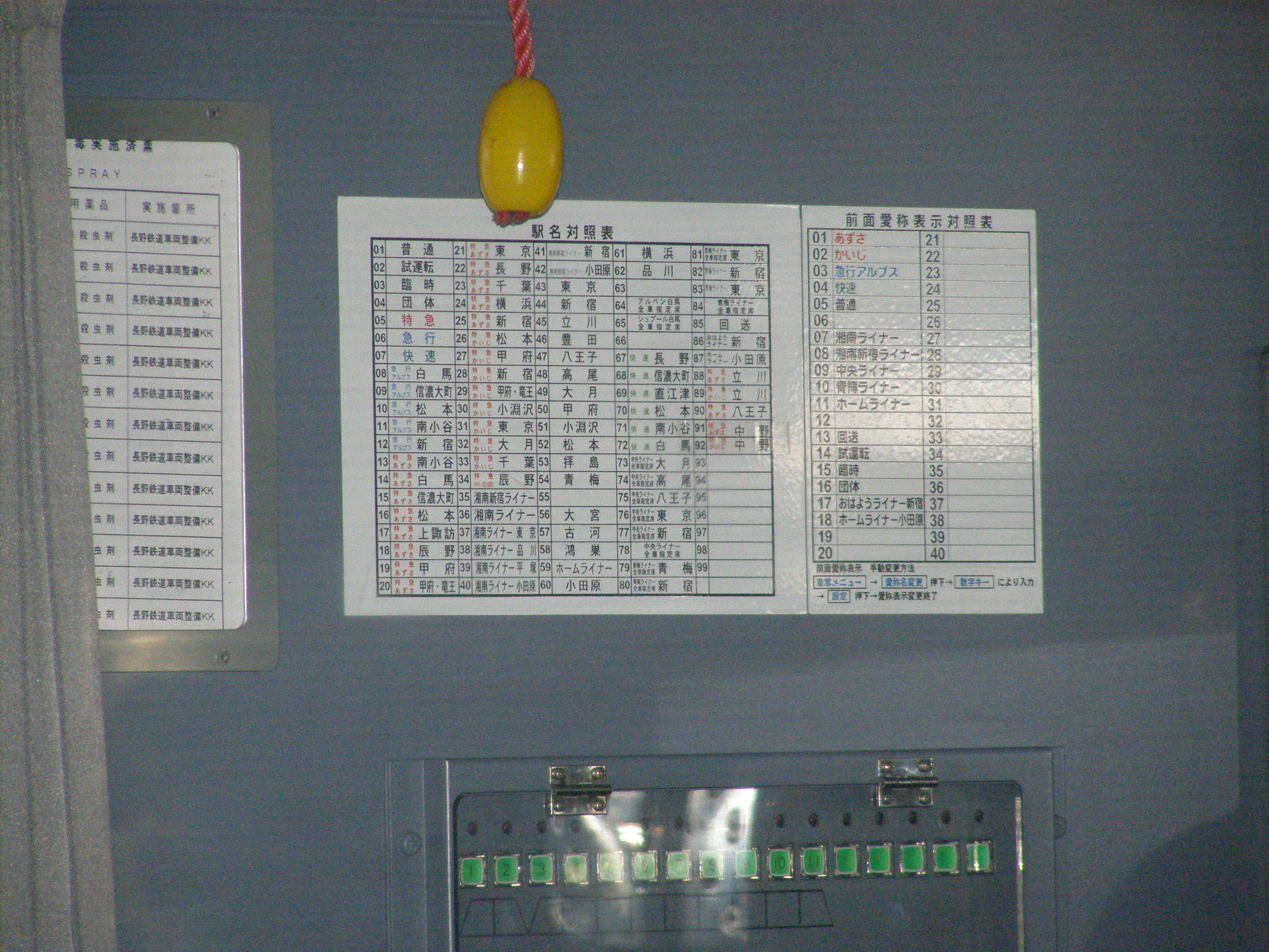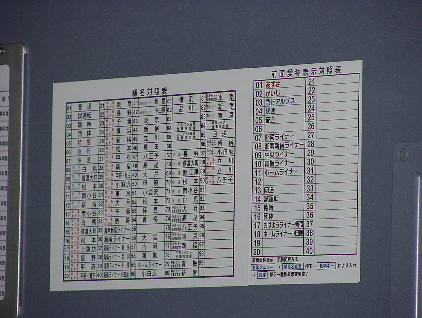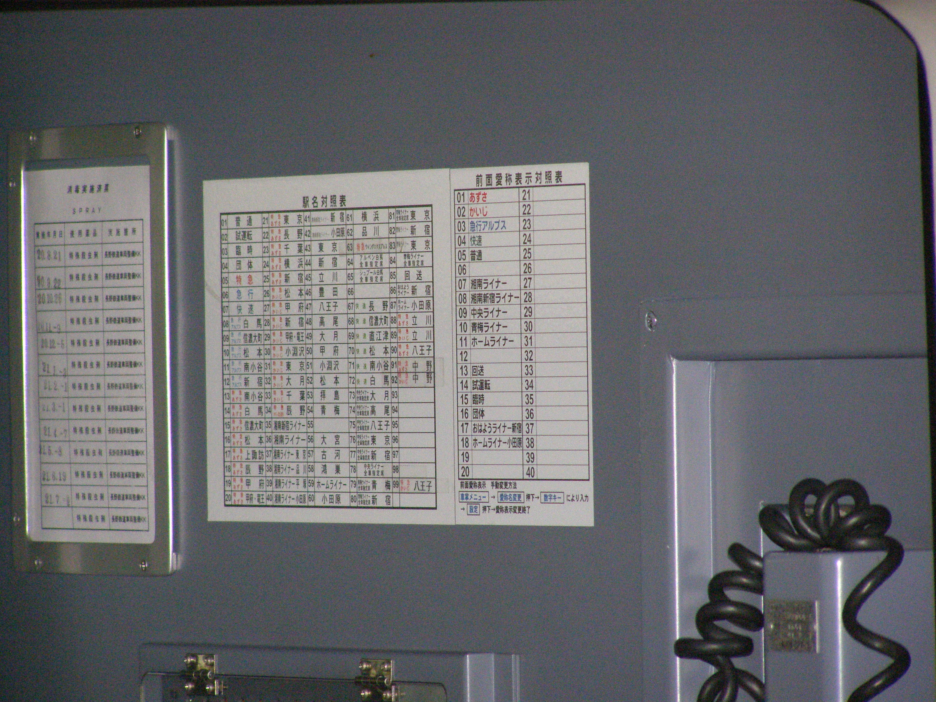 新宿駅で撮影。対照表の文字が小さいのがポイント。150万画素機ではちょっとつらいですね。 角度的には、乗務員ドアが空いているときがベストなので、降車終了確認中に 望遠で狙うとよいでしょう。
