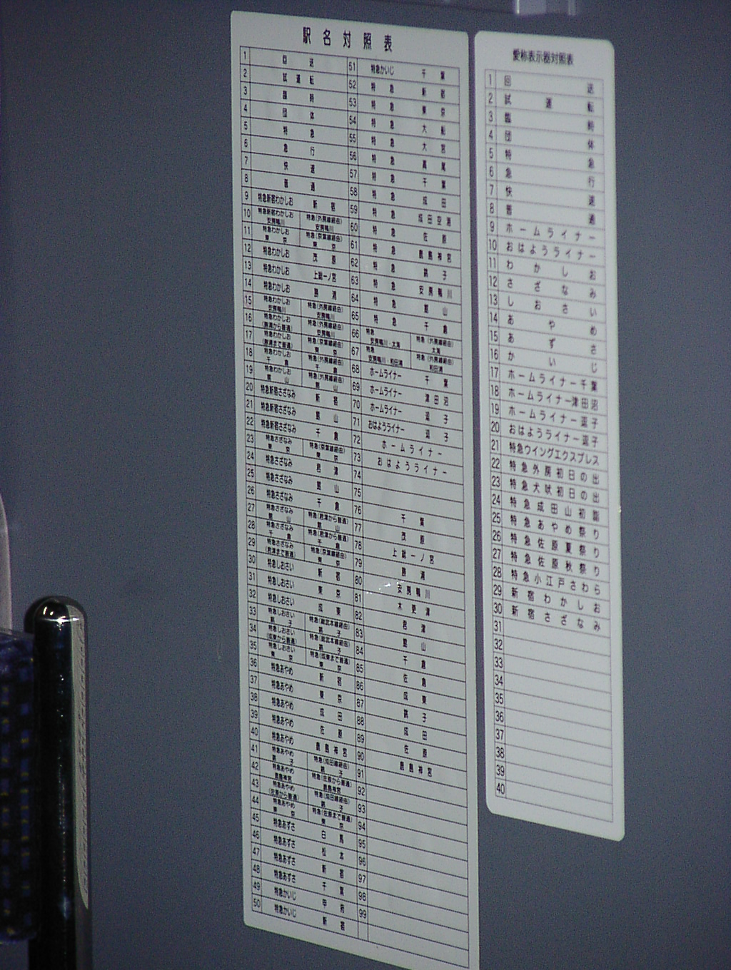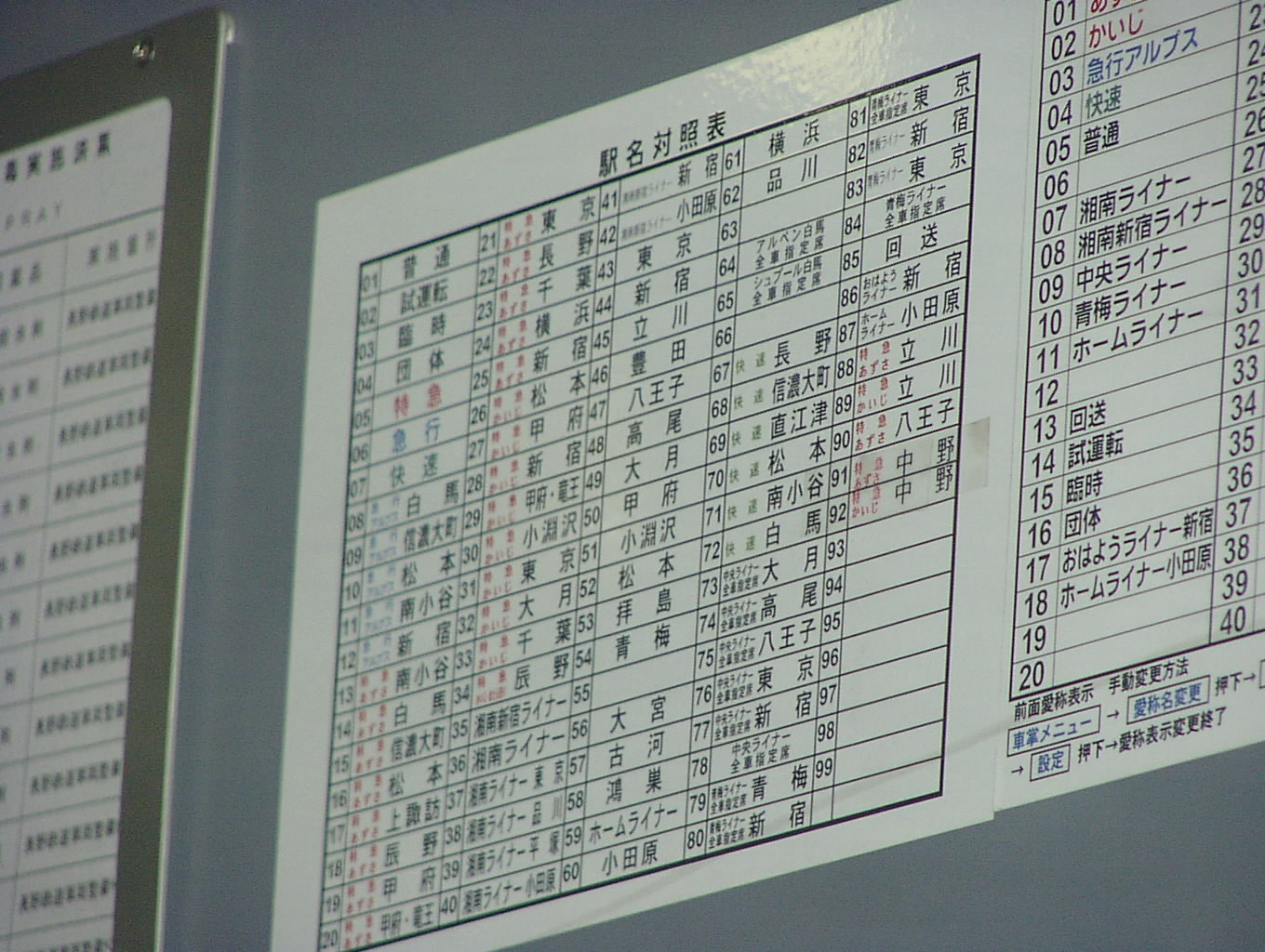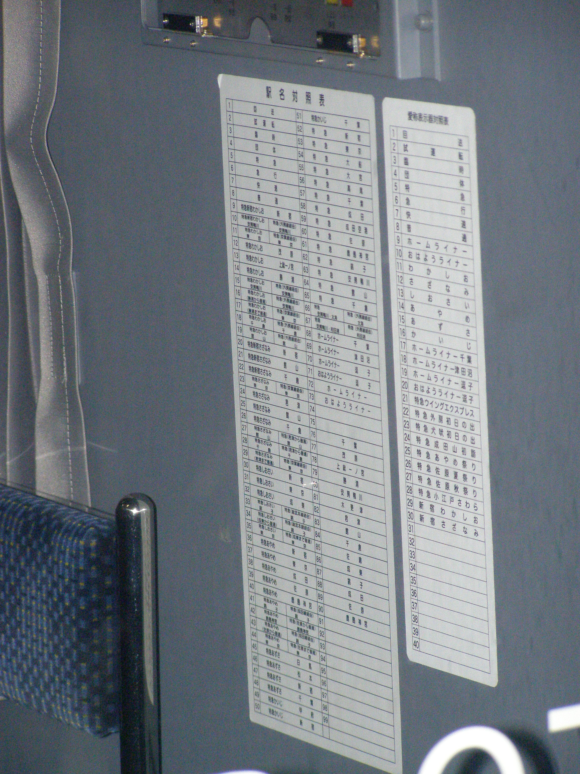 新宿駅で撮影。対照表の文字が小さいのがポイント。150万画素機ではちょっとつらいですね。 角度的には、乗務員ドアが空いているときがベストなので、降車終了確認中に 望遠で狙うとよいでしょう。