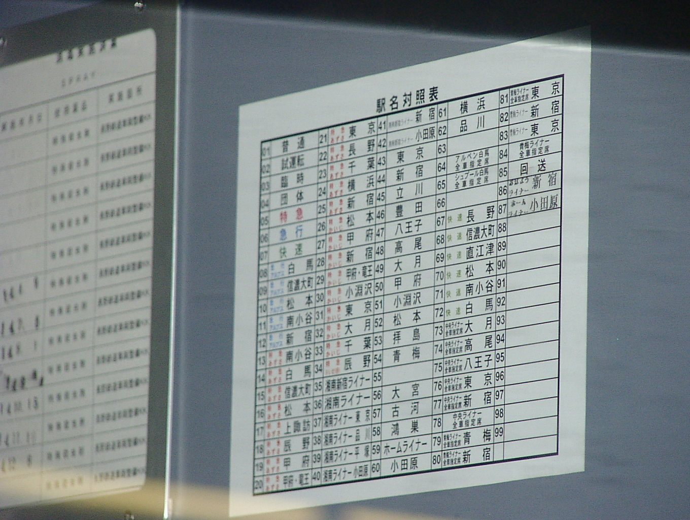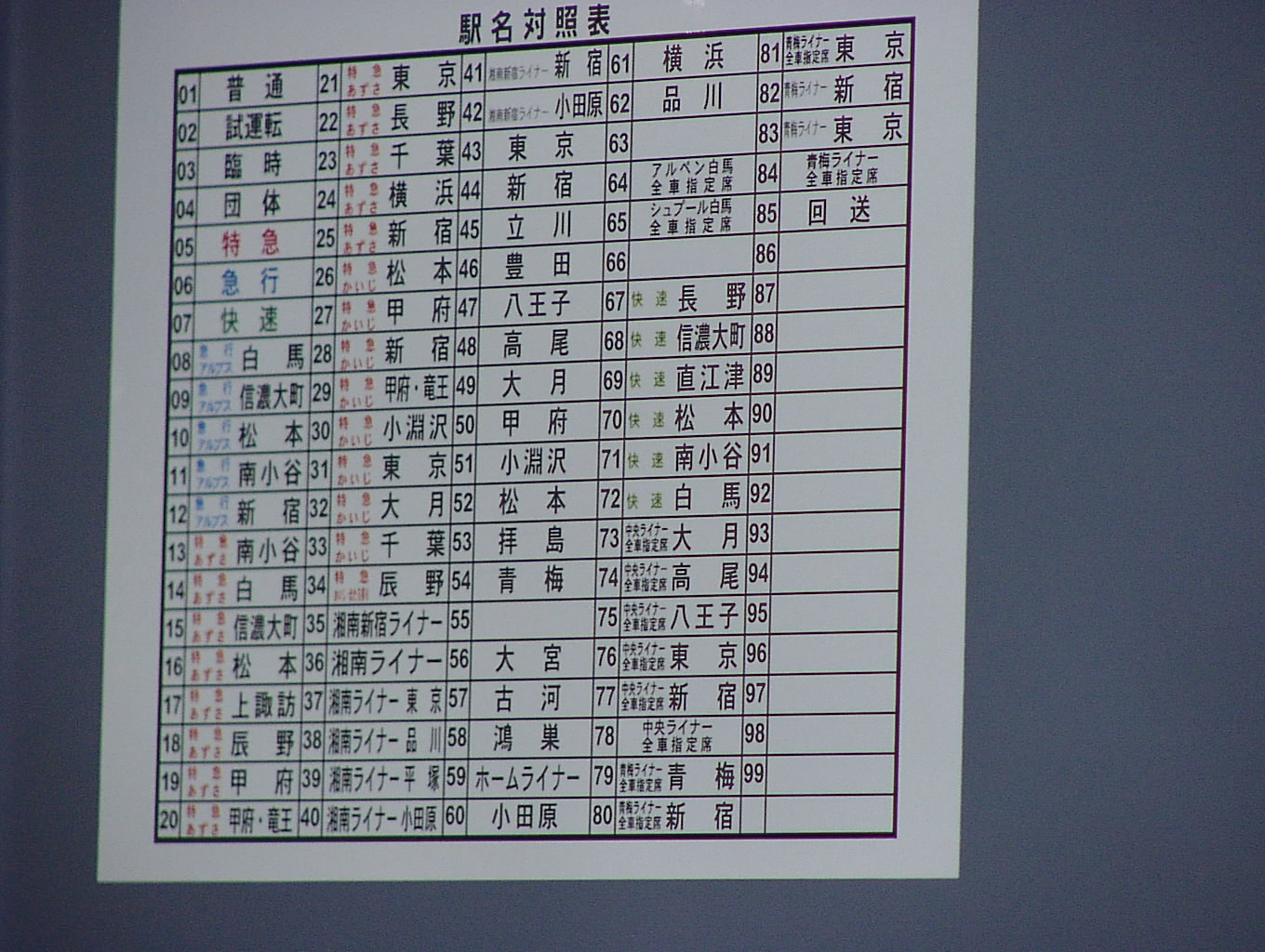 新宿駅で撮影。2002/12改正対応で、今回は変更点があからさまな修正であったため、無理に全体を判読可能レベルにする必要はなく、 したがって若番がピンぼけになっています。