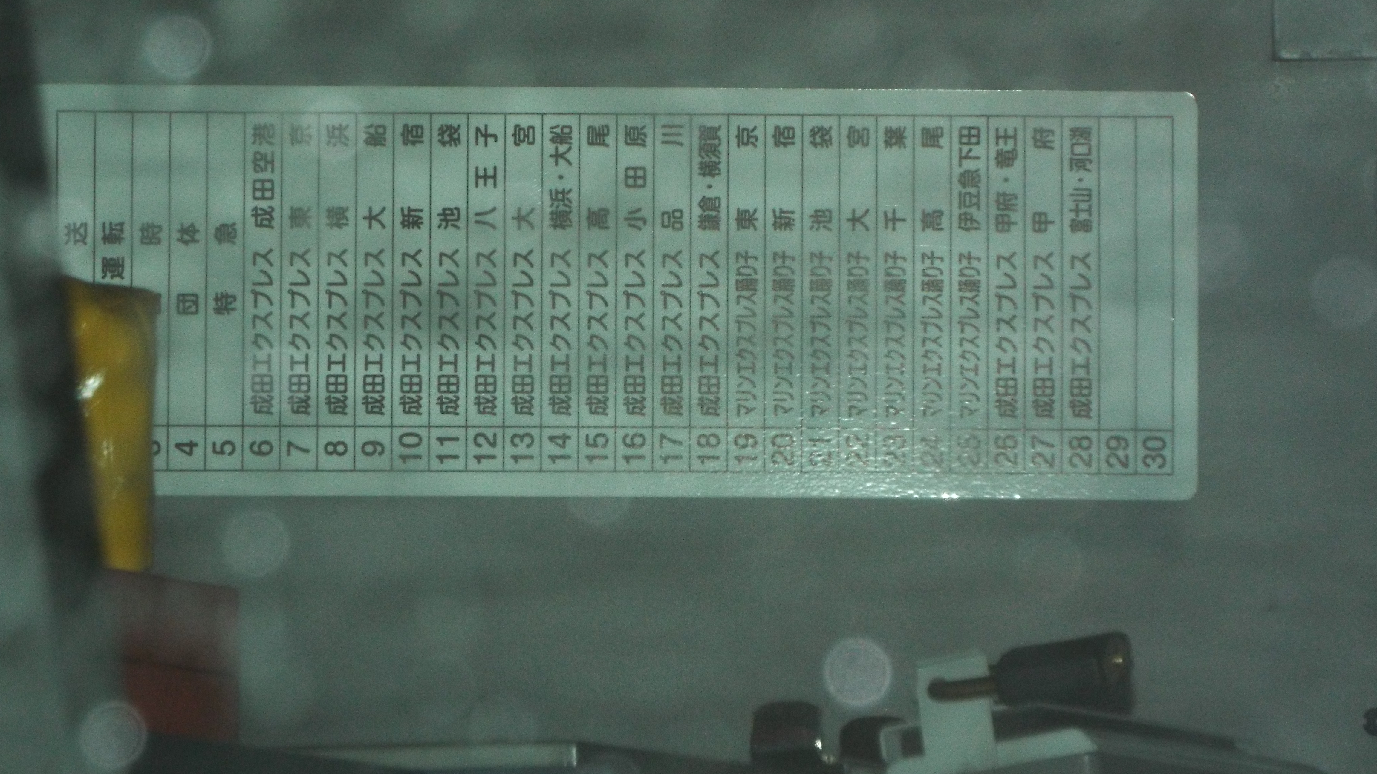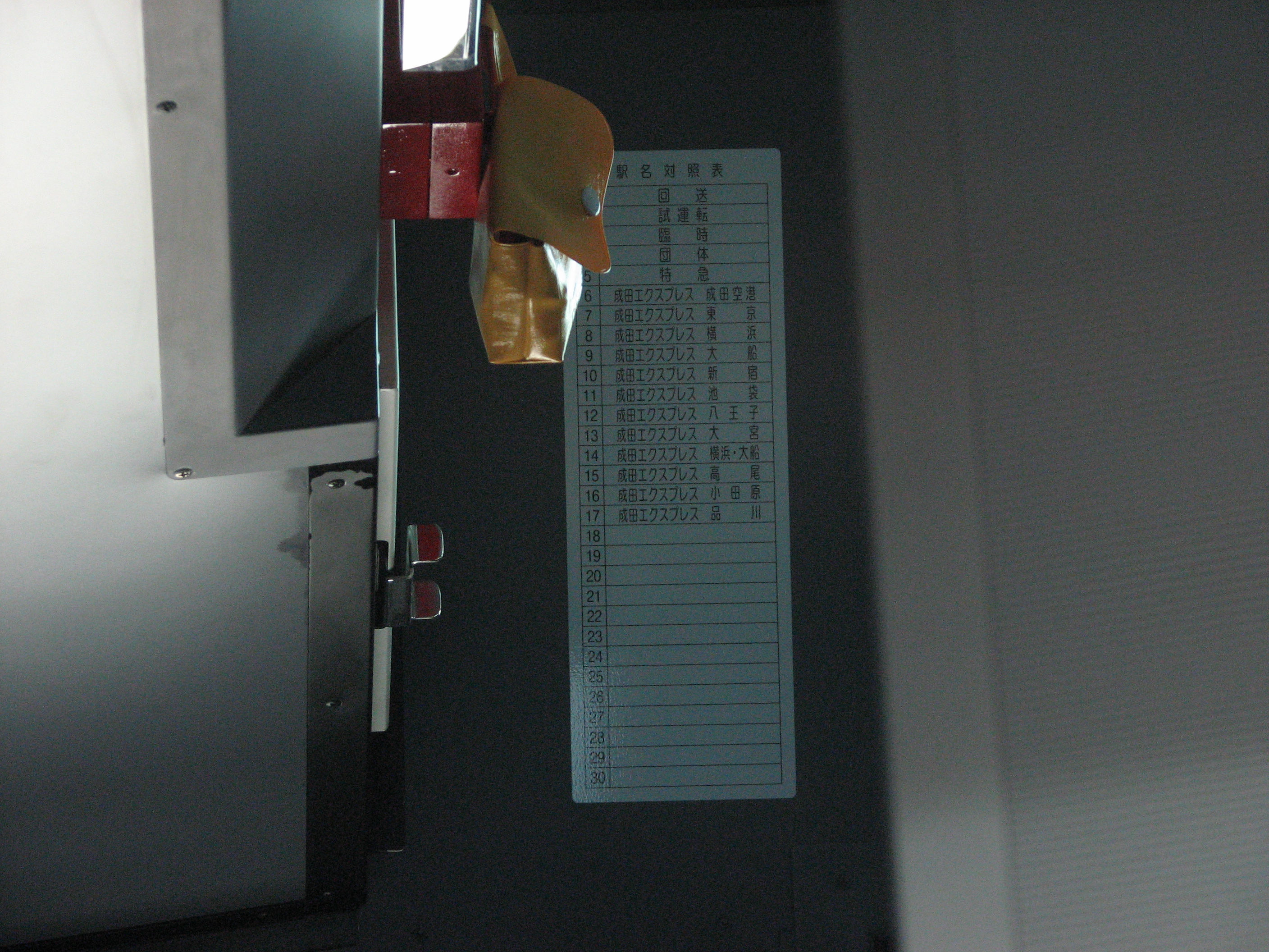 ・・・といってもわかりにくいですね。高運転台構造ですので、ホーム上から乗務員室扉を上のほうに覗き込めばok。 非常に暗い場所に貼られていますので、運転士さんがいないときを狙うか、暗くても撮れる高感度のカメラを使うかの2択になろうかと思います。