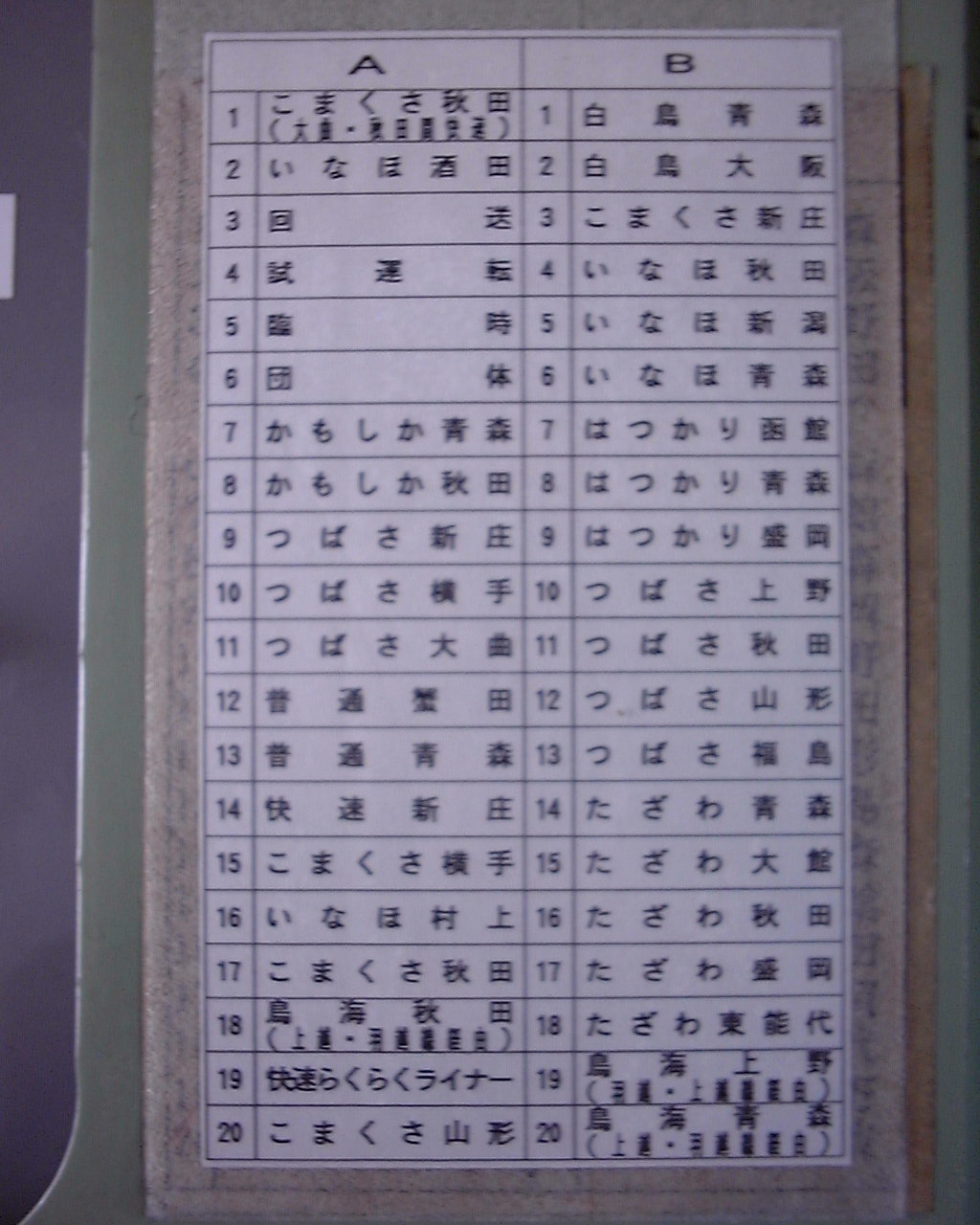 JR東日本の485系幕車は、運転台助士側背面に貼付されています。LED車はモニタによる制御のため、紙貼りの対照表はありません。