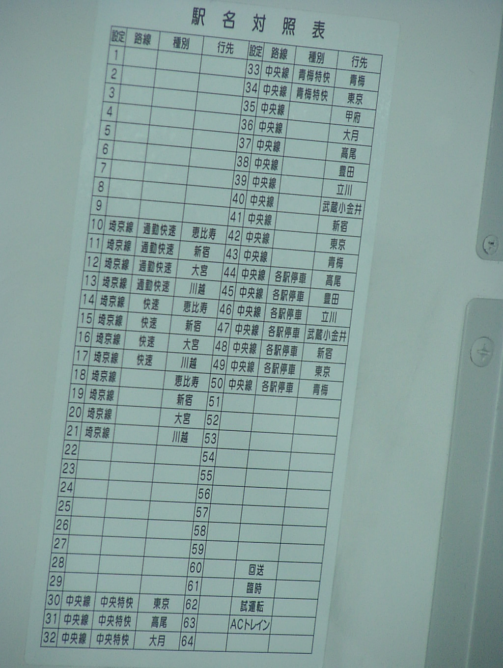 AC Trainは撮影機会が殆どなかったと思います。この車も一応対照表を装備していました。 近郊側(クハE993-1)の運転士側側壁上部に貼付されていました。通勤側は貼付されなかった模様です。