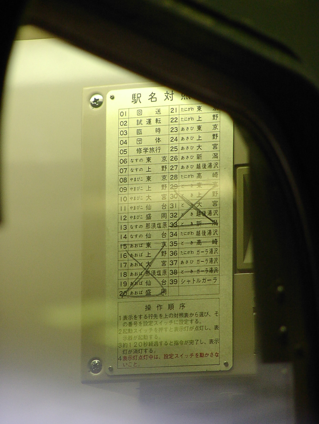 新幹線200系電車は、オリジナル車は幕式が採用されており、方向幕設定機は編成により異なります。 更新車はE1系以降と同様のLED表示機が採用されているため、対照表はありません。