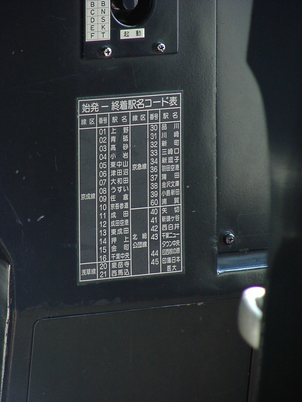 LED車なので設定機対照表のみです。 京急蒲田駅で撮影。助士側乗務員室扉(外側)からの位置ですので、 好条件での撮影は難しいです。時間的に楽なのは羽田空港or印旛日本医大の 折り返し時になると思いますが、両駅は場所的に一長一短があります。