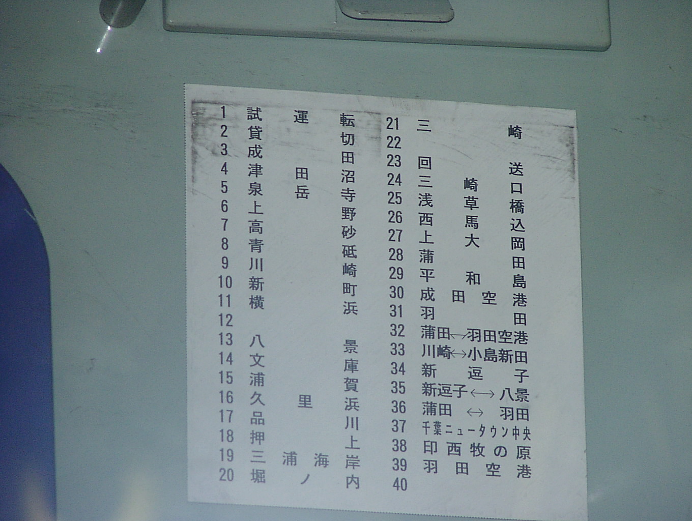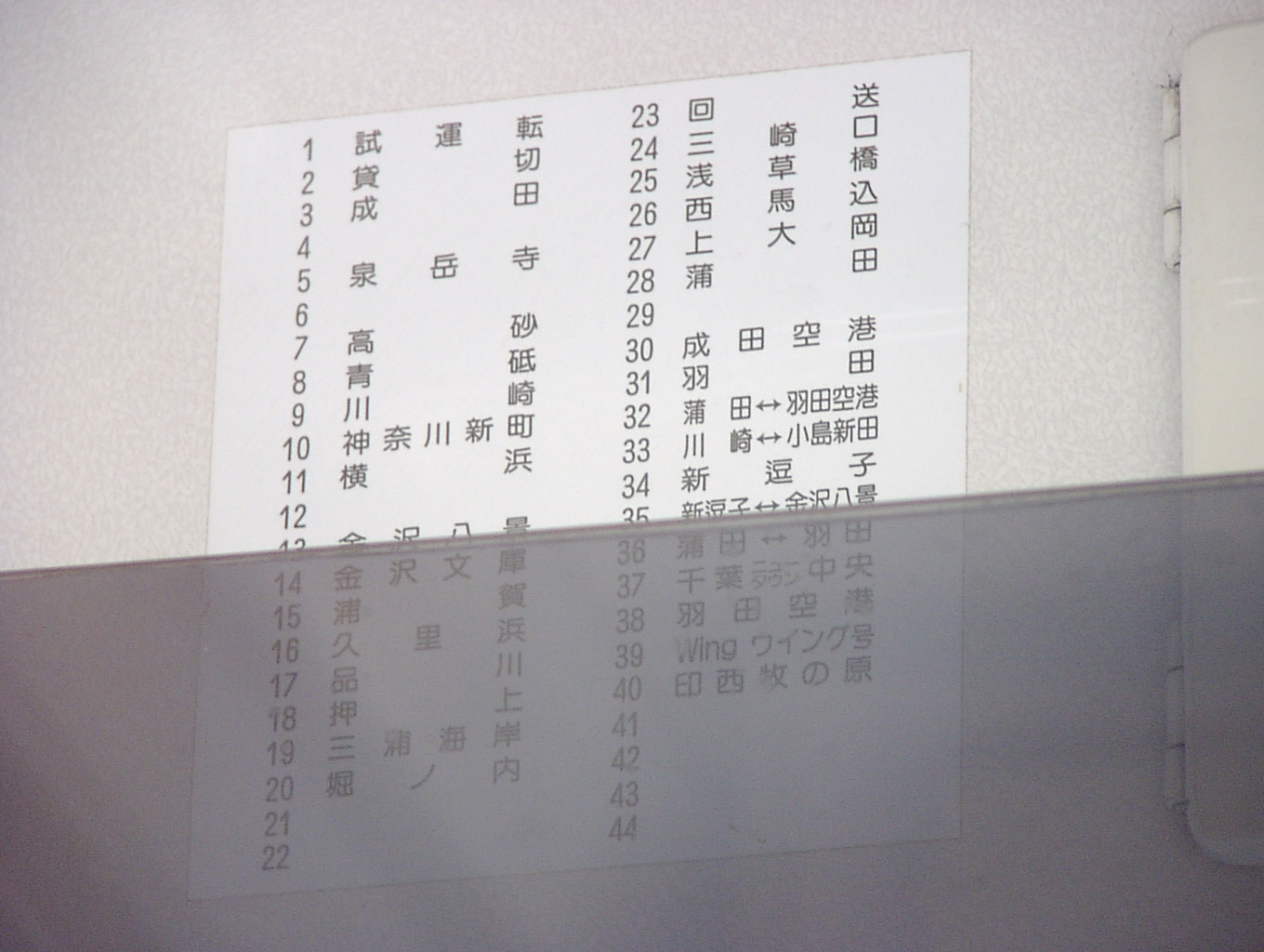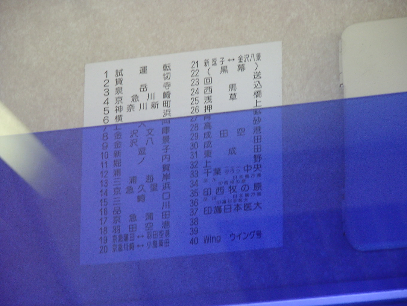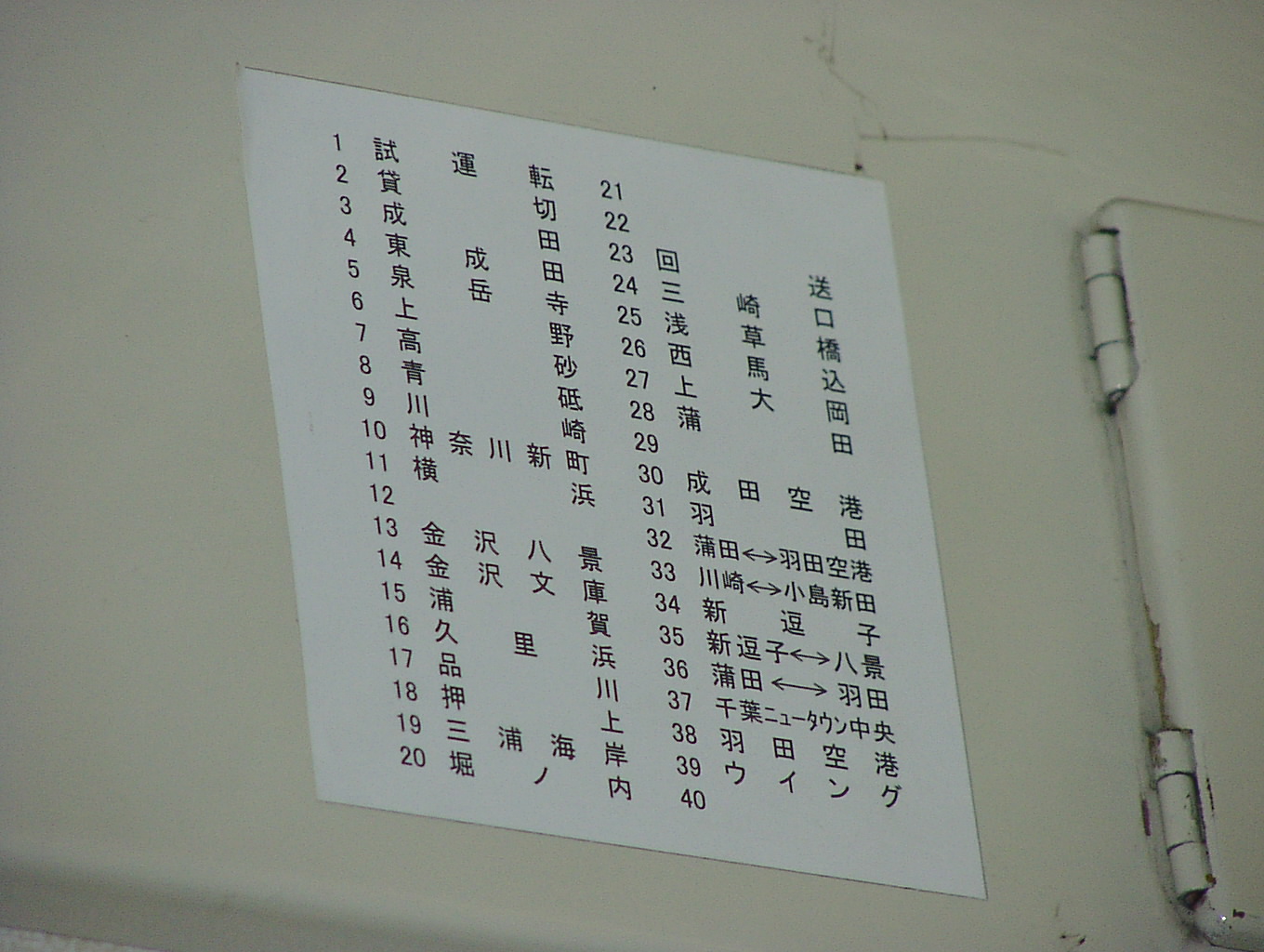 車内で撮影。30コマ機の羽田空港対応幕バージョン。なぜか幕対照表は40コマ。 ただ単に羽田空港が追加されただけと思ったら大間違いなのです。 対応車は北側であっても行先部分のみ対照表が貼付されています。