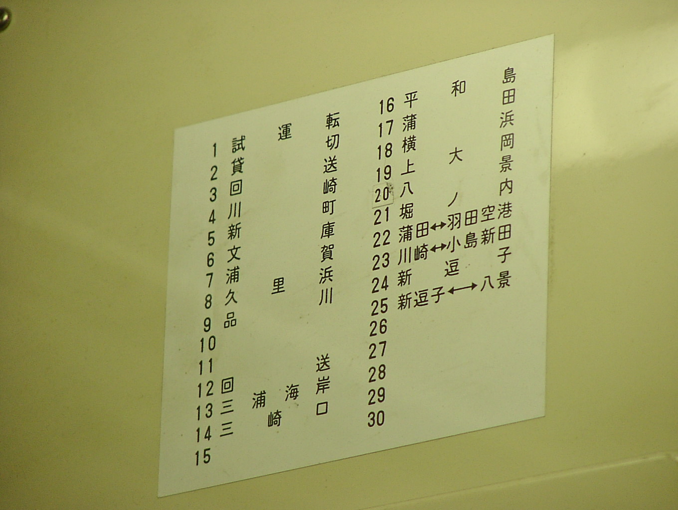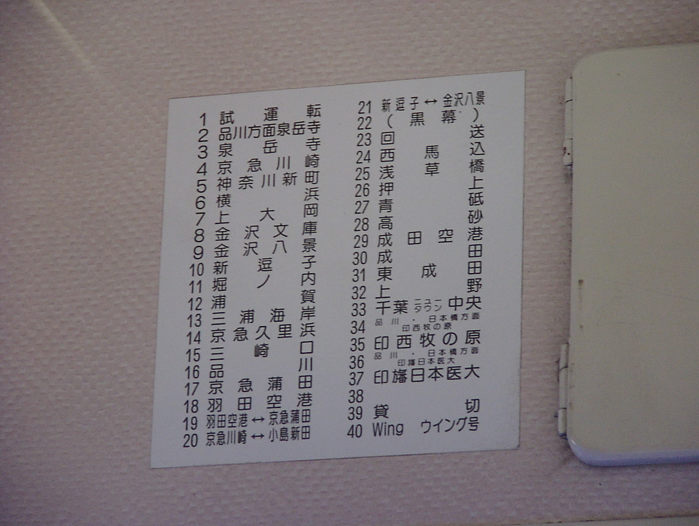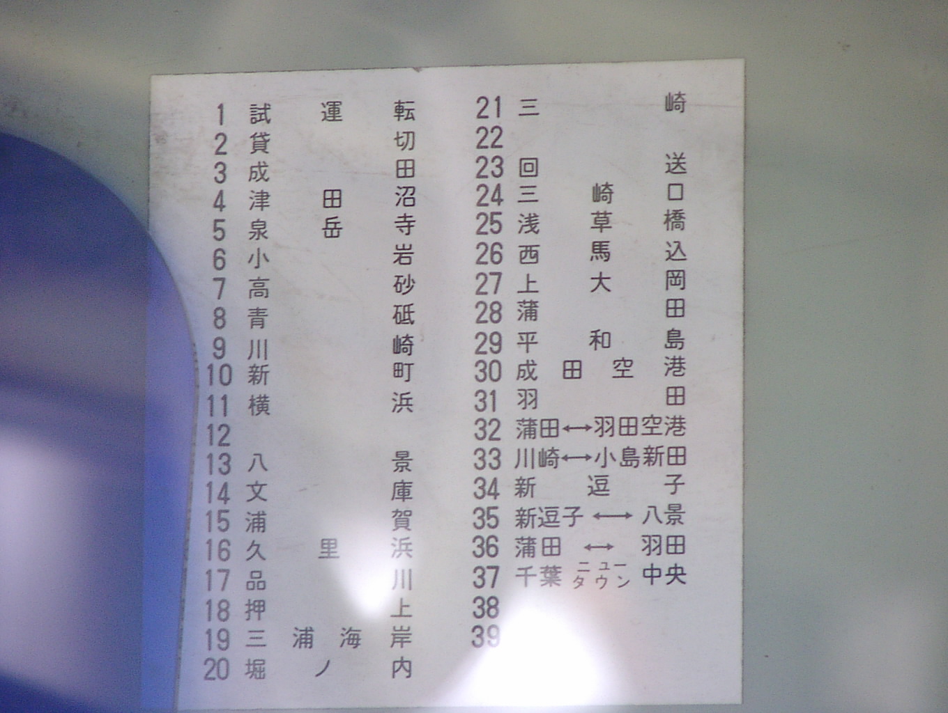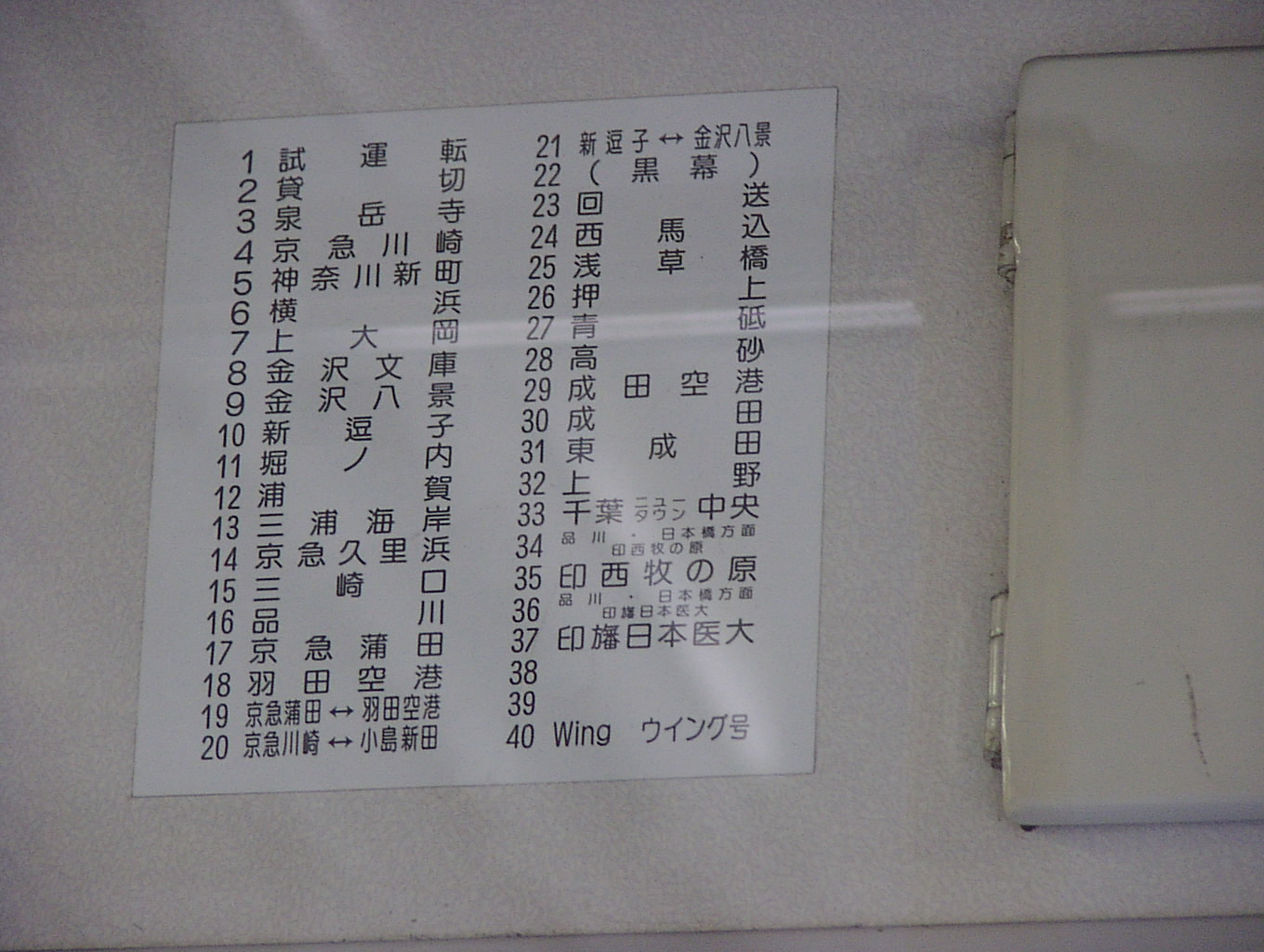 車内で撮影。30コマ機の羽田空港対応幕バージョン。なぜか幕対照表は40コマ。 ただ単に羽田空港が追加されただけと思ったら大間違いなのです。 対応車は北側であっても行先部分のみ対照表が貼付されています。