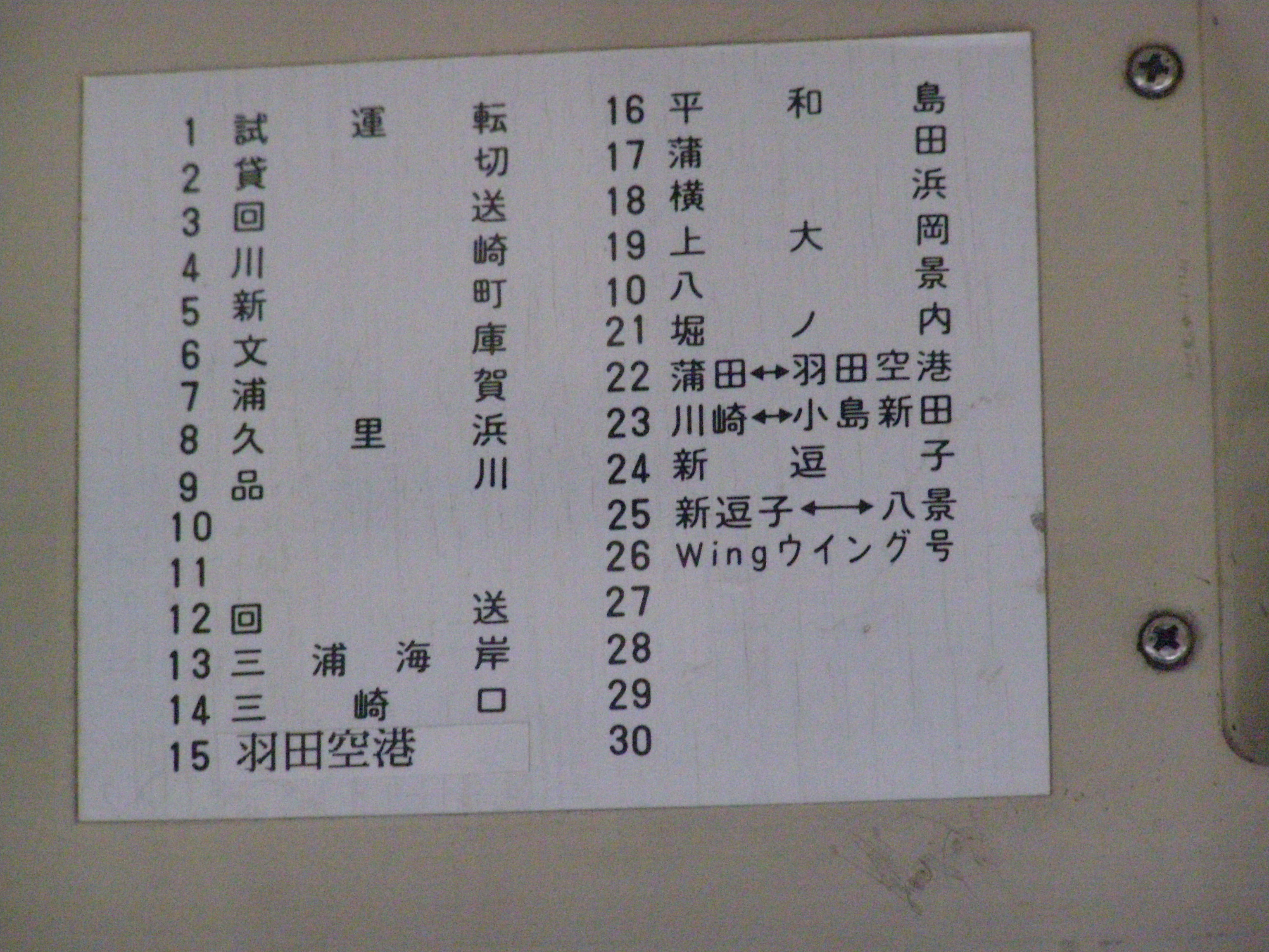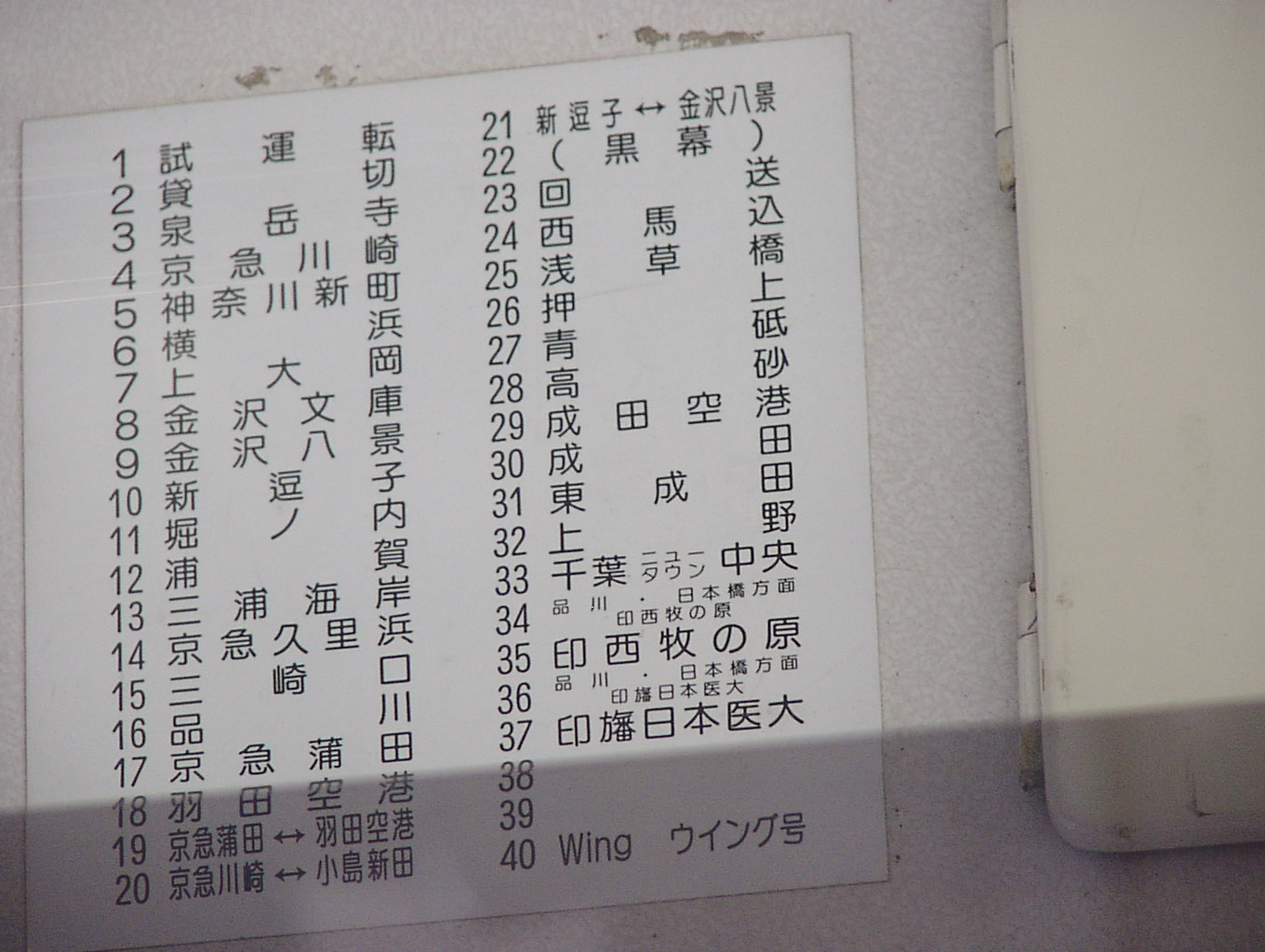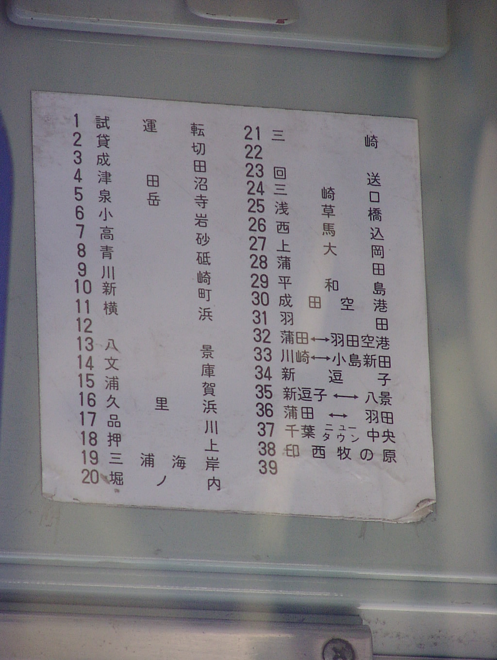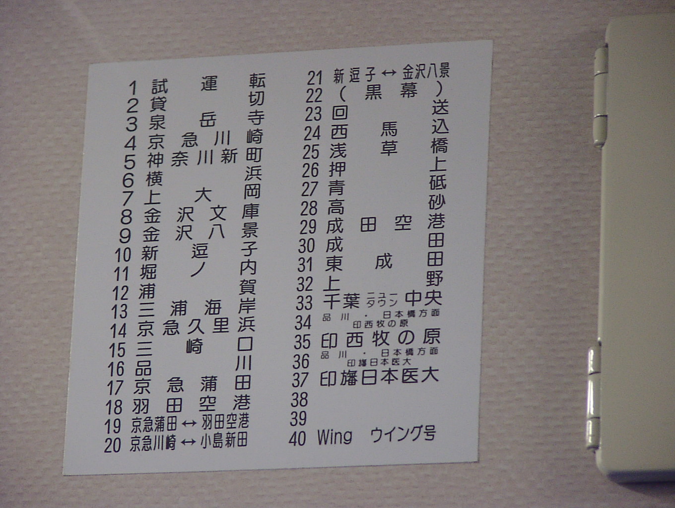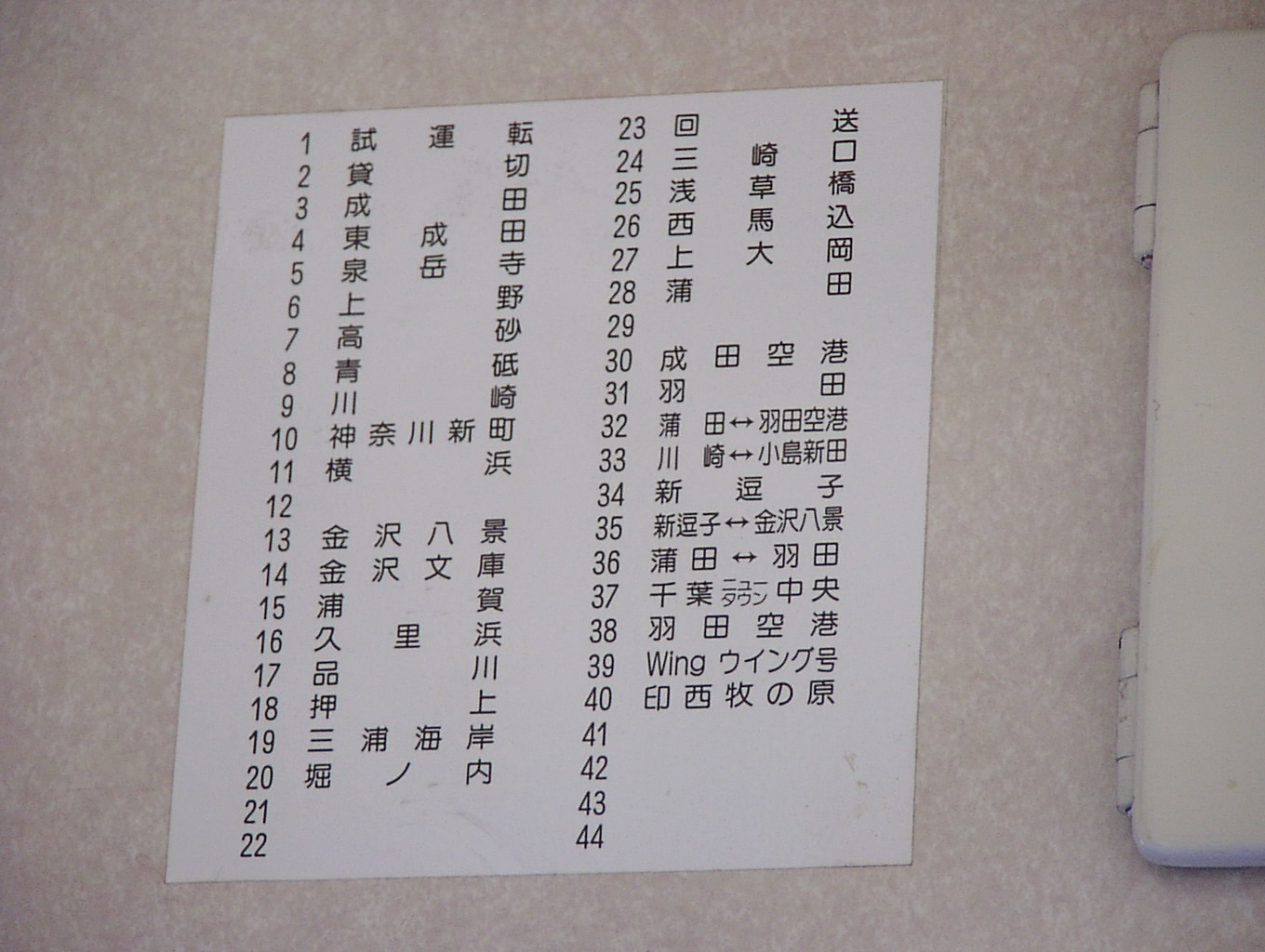 車内で撮影。30コマ機の羽田空港対応幕バージョン。なぜか幕対照表は40コマ。 ただ単に羽田空港が追加されただけと思ったら大間違いなのです。 対応車は北側であっても行先部分のみ対照表が貼付されています。