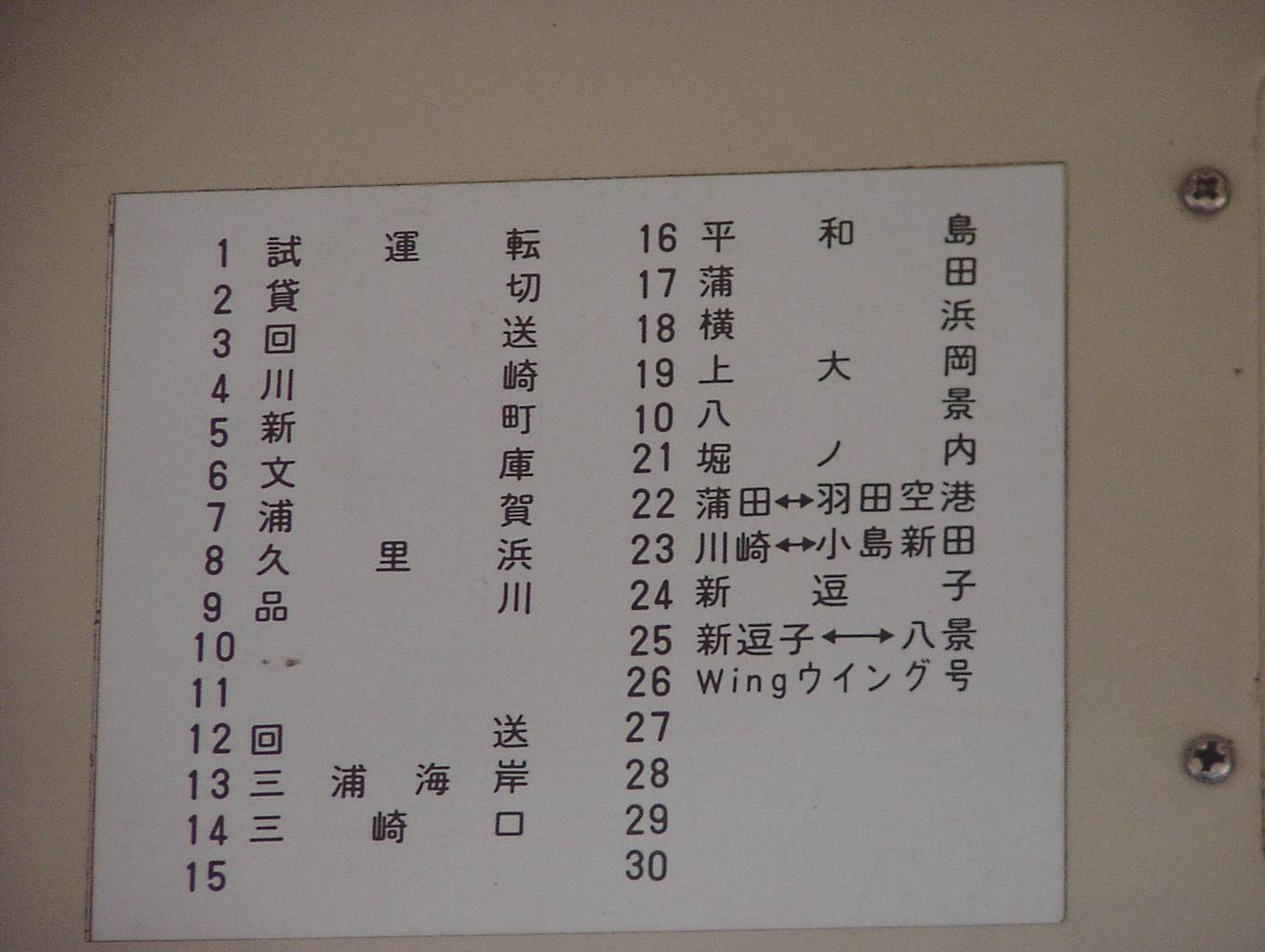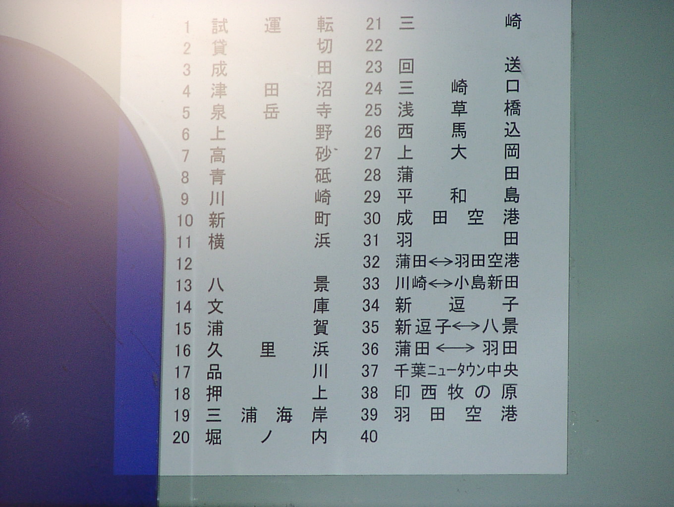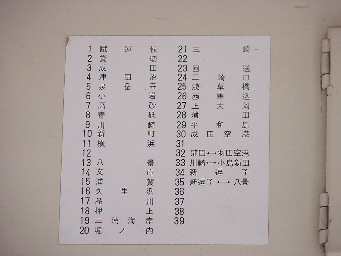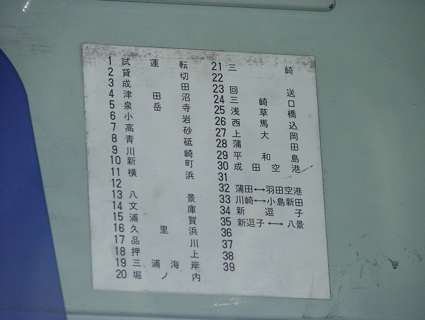 車内で撮影。30コマ機の羽田空港対応幕バージョン。なぜか幕対照表は40コマ。 ただ単に羽田空港が追加されただけと思ったら大間違いなのです。 対応車は北側であっても行先部分のみ対照表が貼付されています。