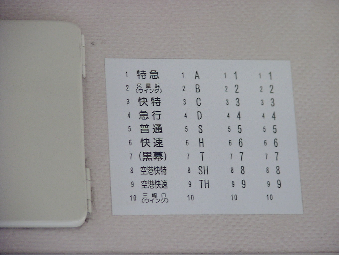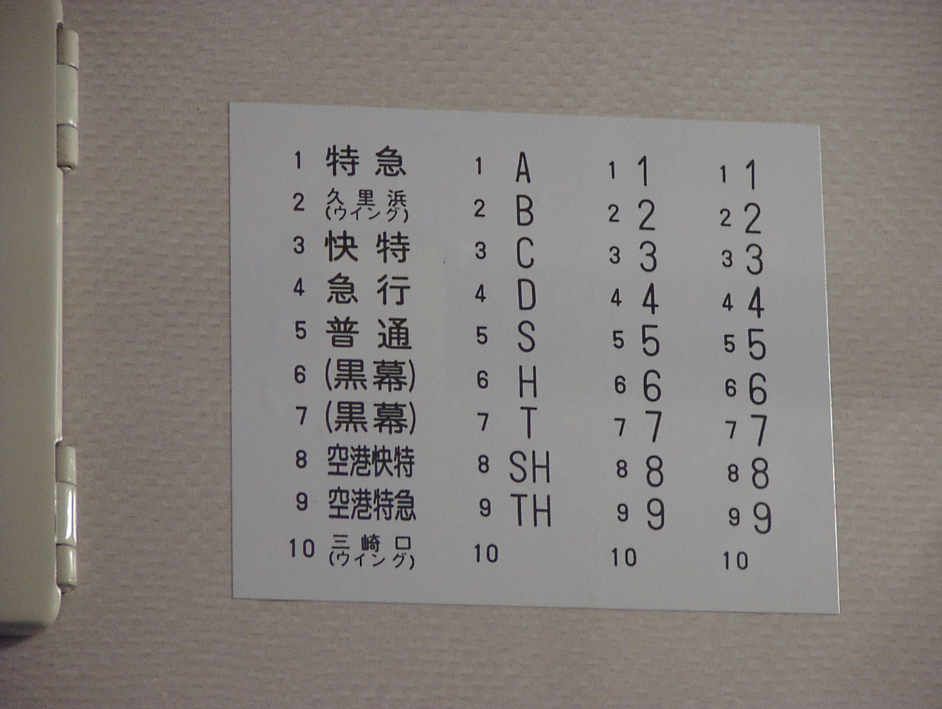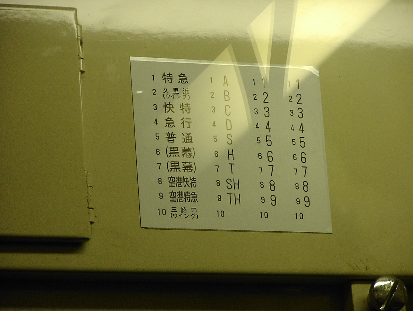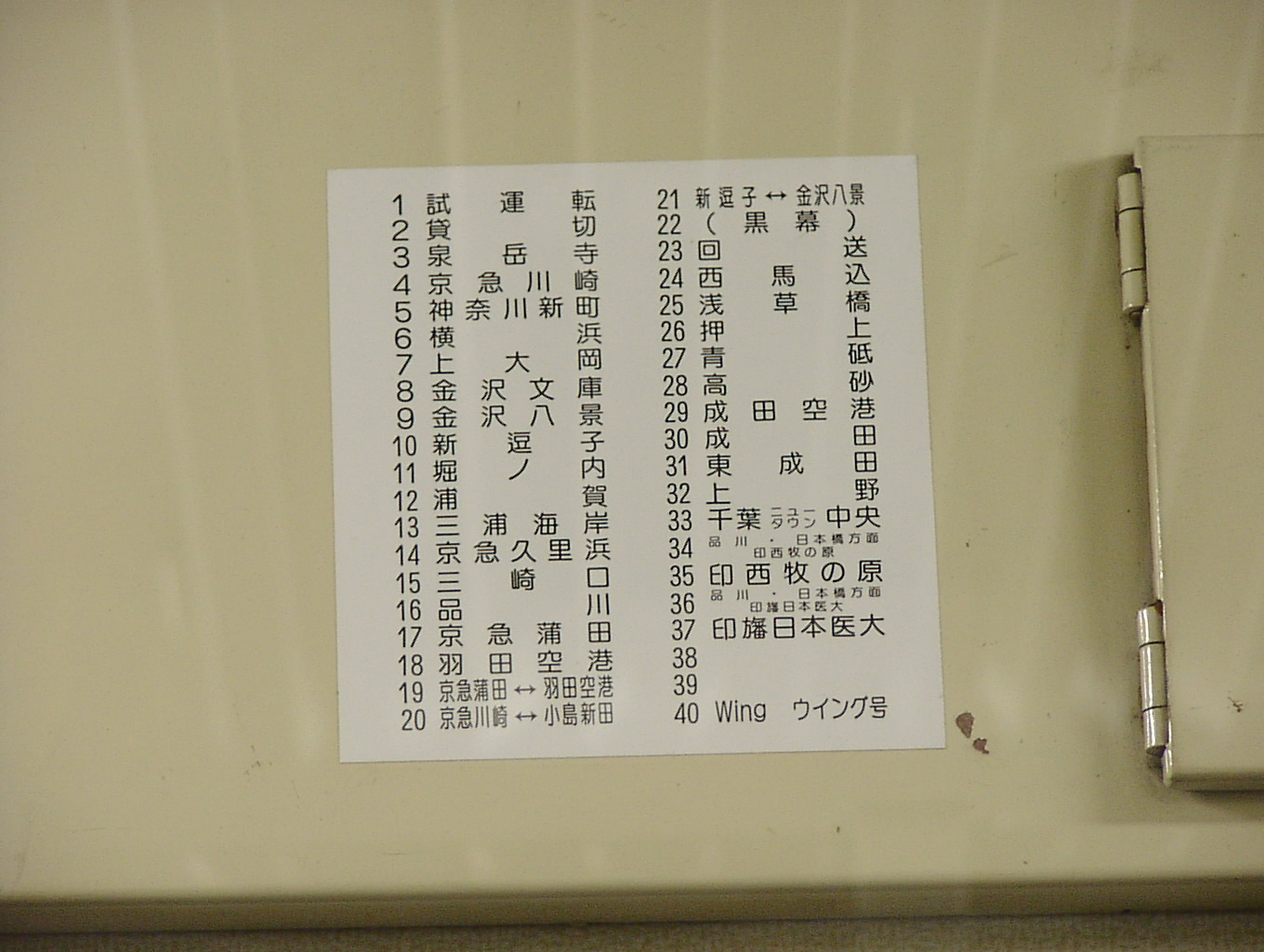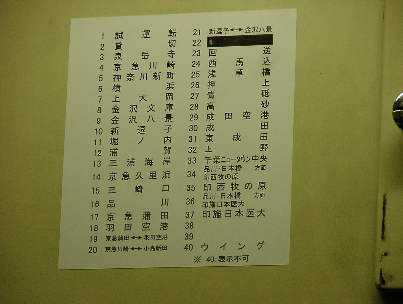 京急は、各々の前面表示機の蓋に貼付されています。 ただし前面がLEDの編成には対照表が蓋の中にあるものと考えられます。