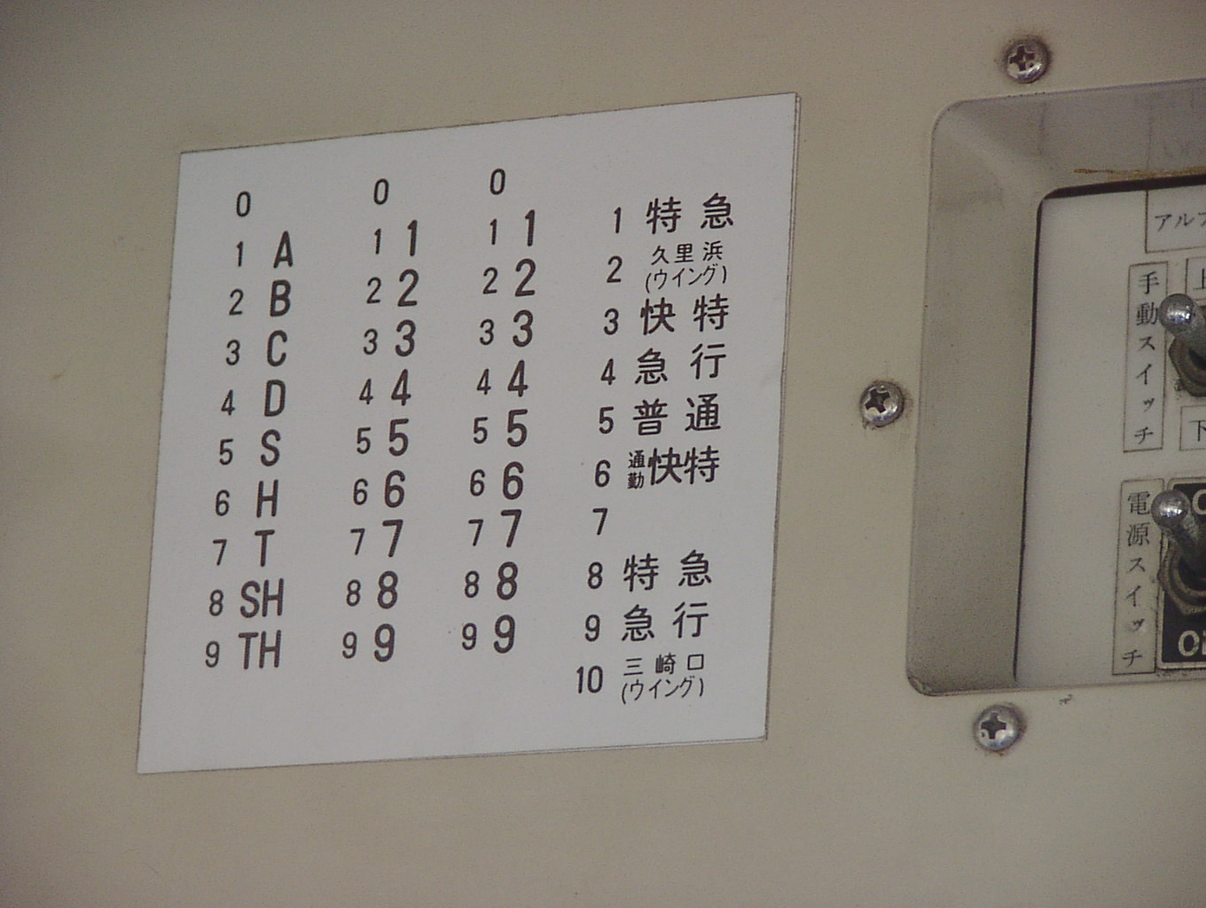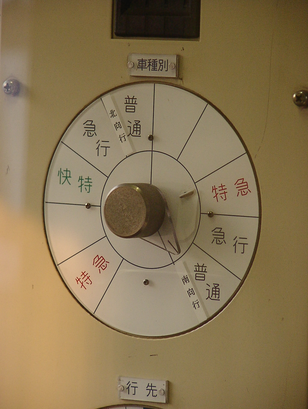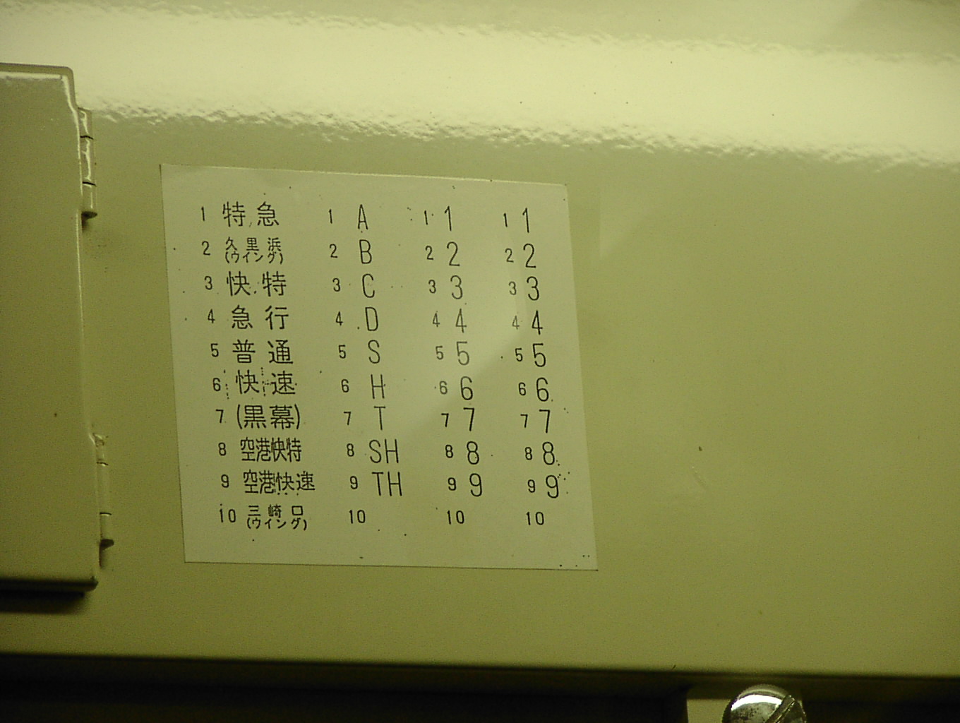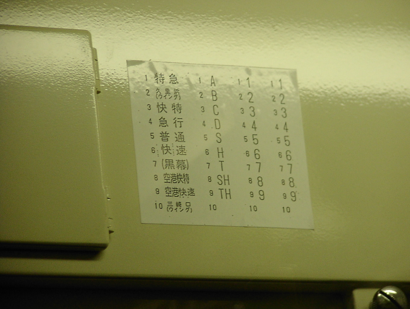 車内で撮影。800形は北側助士側側壁のダイヤル式装置で設定しますが、 他形式にある装置蓋への対照表貼付が北側は省略されている編成が多いので、 南側の対照表か、北側の装置そのものかのいずれかを選択しましょう。 もっとも、南側であっても貼ってある保証はありません。 もうすぐ絶滅が予想される旧幕。