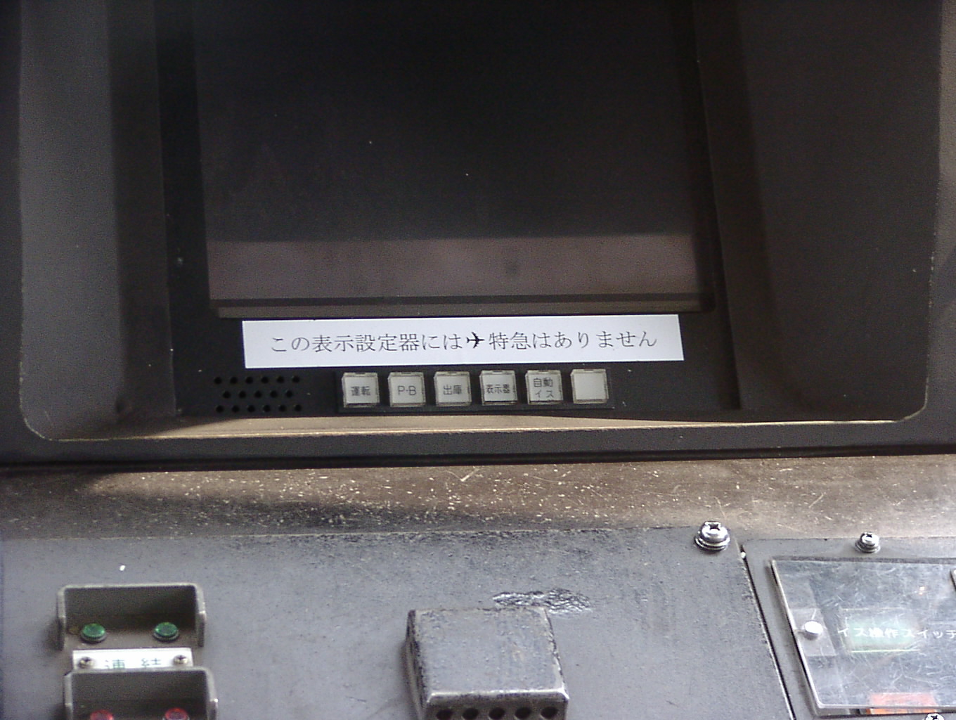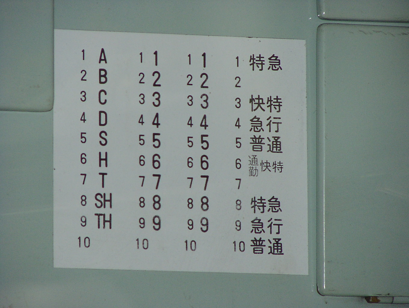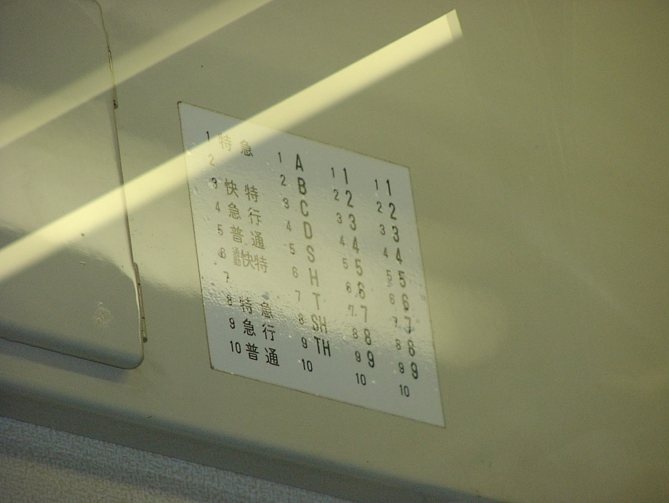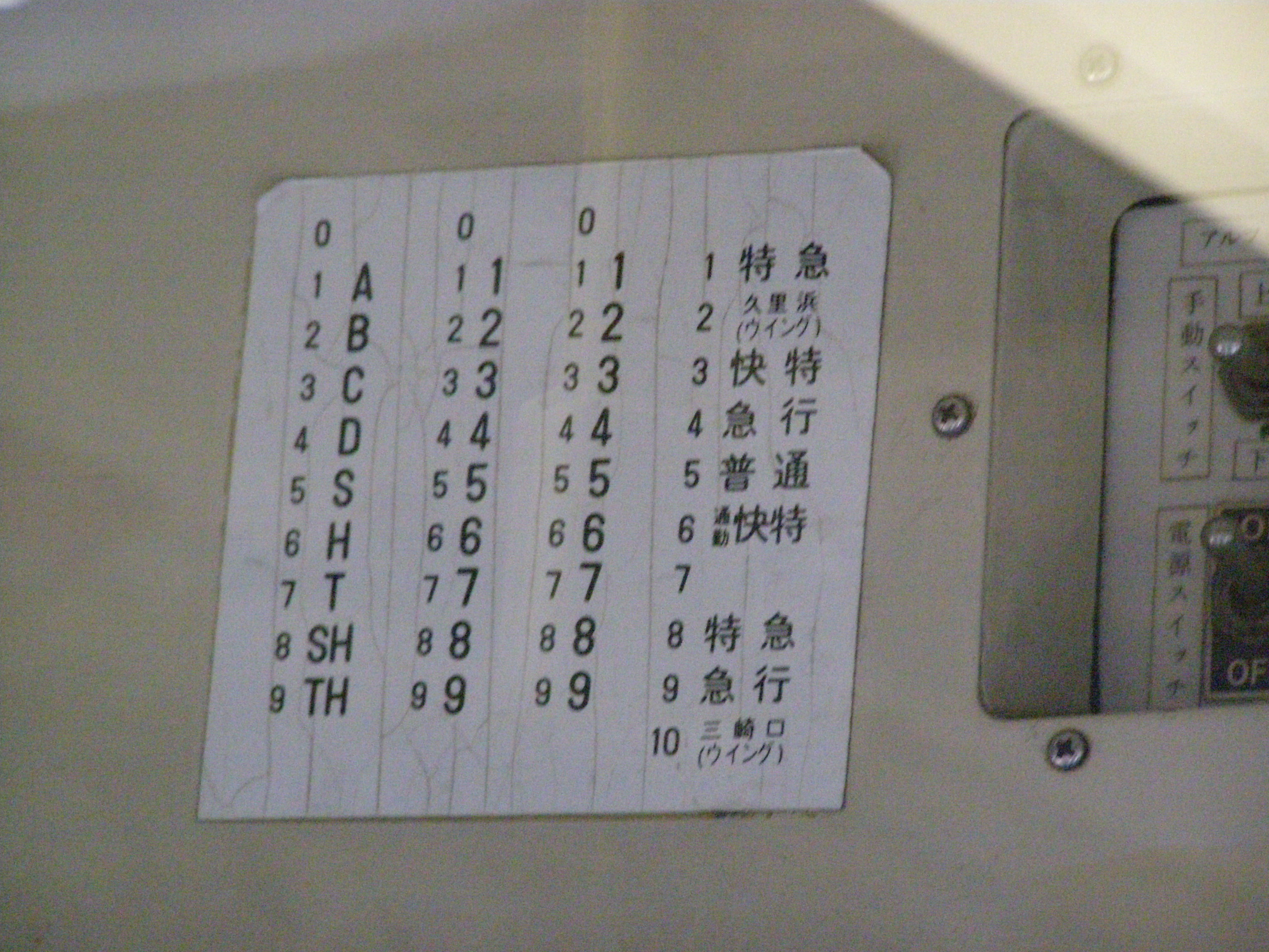 車内で撮影。800形は北側助士側側壁のダイヤル式装置で設定しますが、 他形式にある装置蓋への対照表貼付が北側は省略されている編成が多いので、 南側の対照表か、北側の装置そのものかのいずれかを選択しましょう。 もっとも、南側であっても貼ってある保証はありません。 もうすぐ絶滅が予想される旧幕。