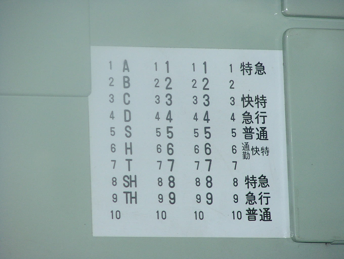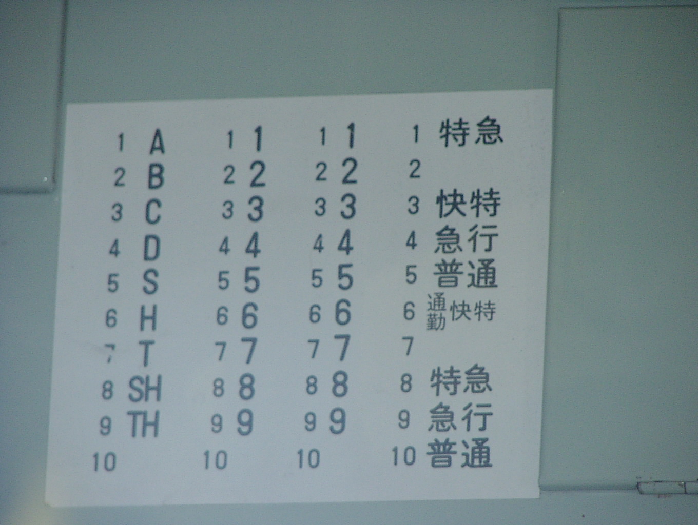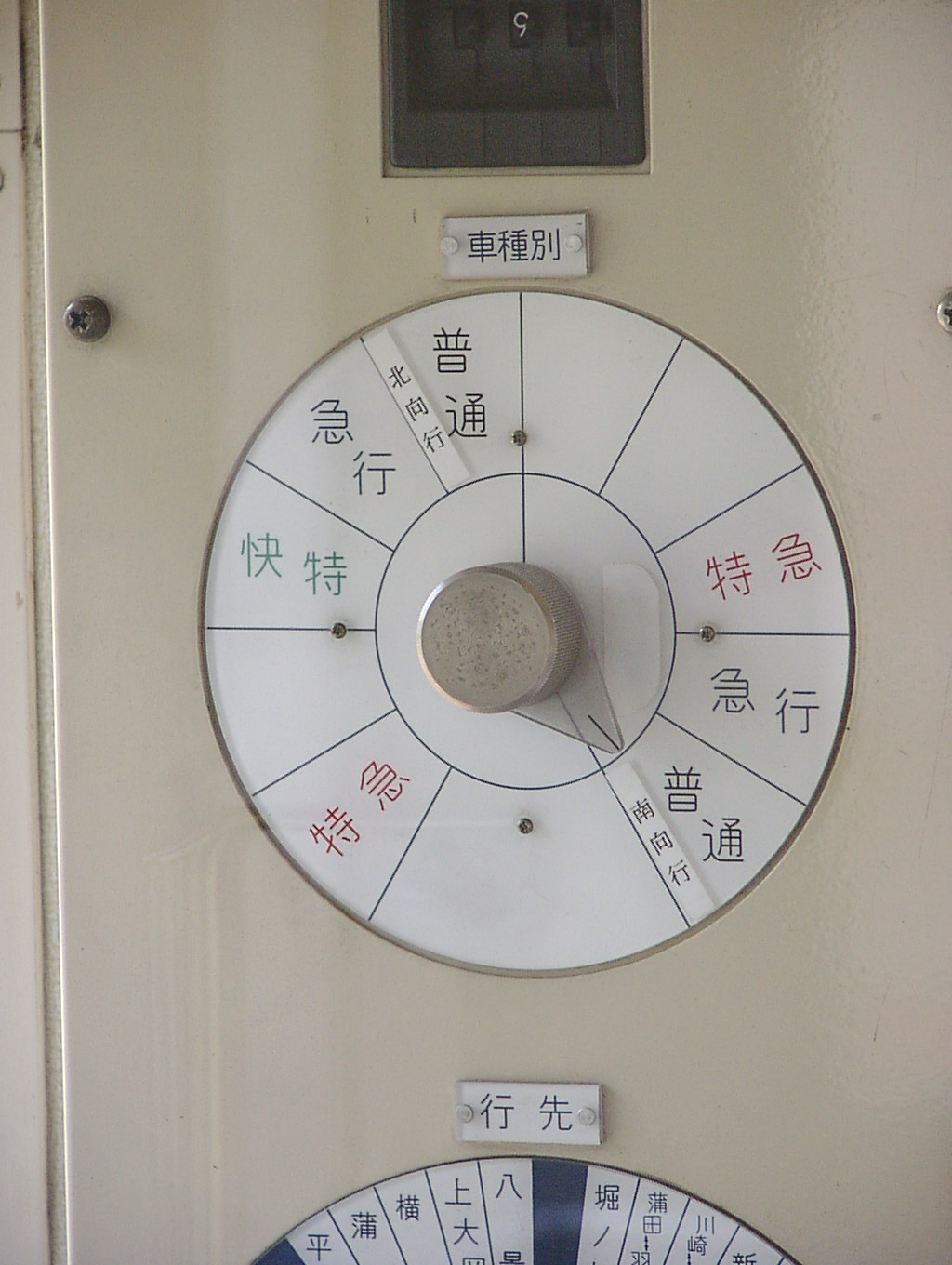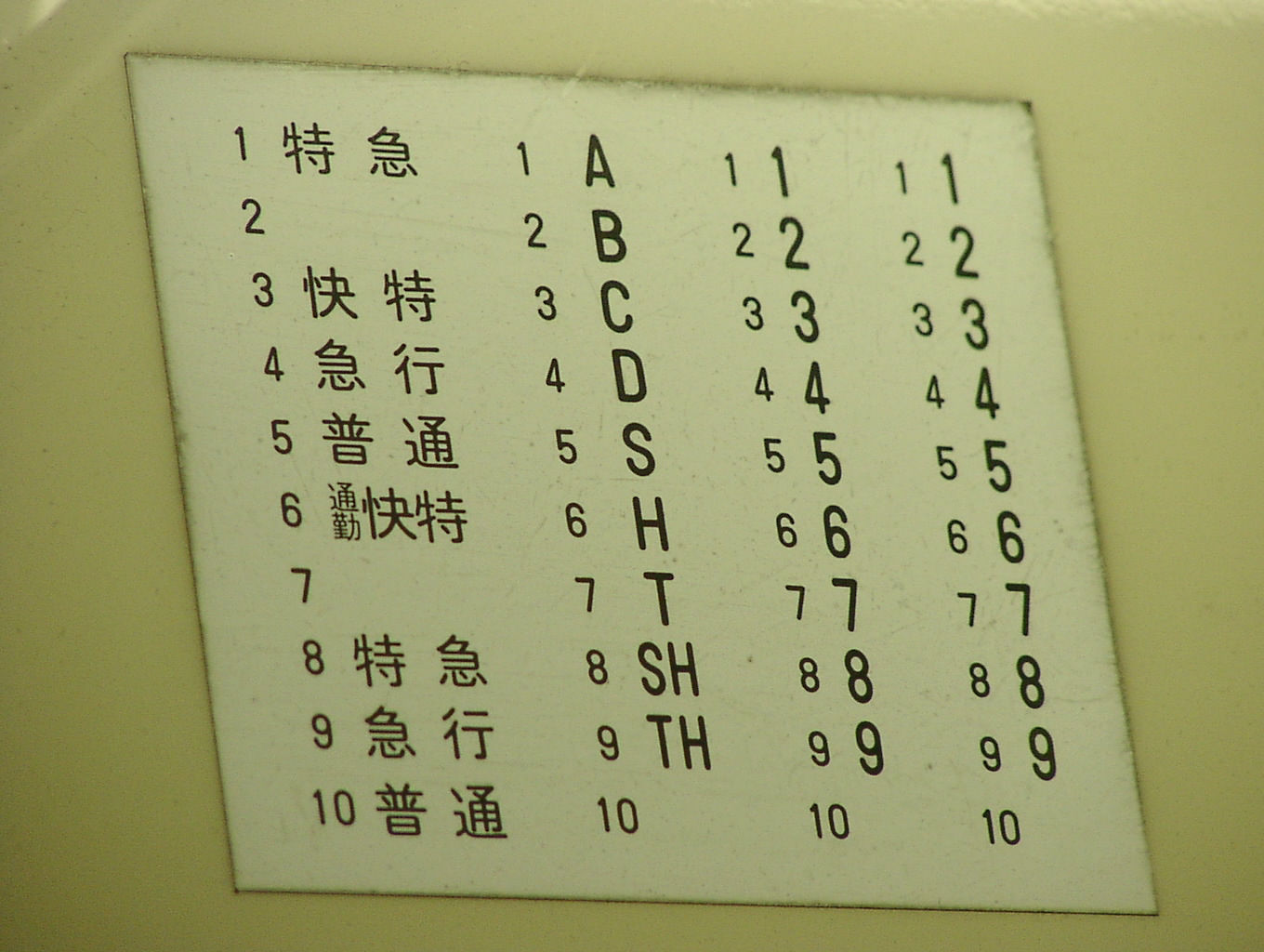 車内で撮影。800形は北側助士側側壁のダイヤル式装置で設定しますが、 他形式にある装置蓋への対照表貼付が北側は省略されている編成が多いので、 南側の対照表か、北側の装置そのものかのいずれかを選択しましょう。 もっとも、南側であっても貼ってある保証はありません。 もうすぐ絶滅が予想される旧幕。