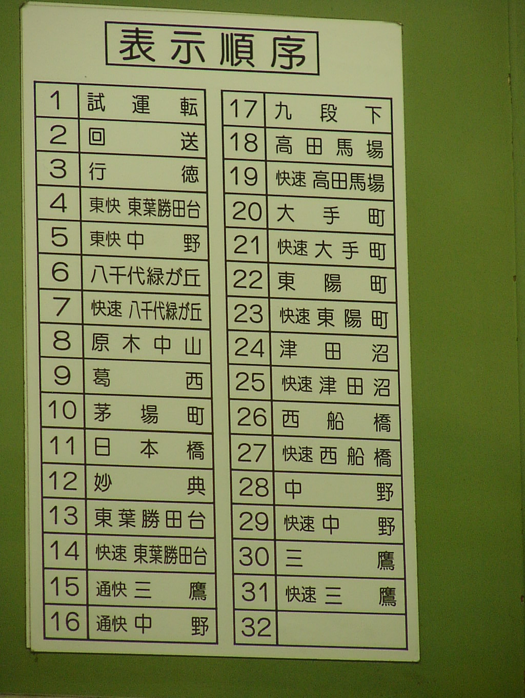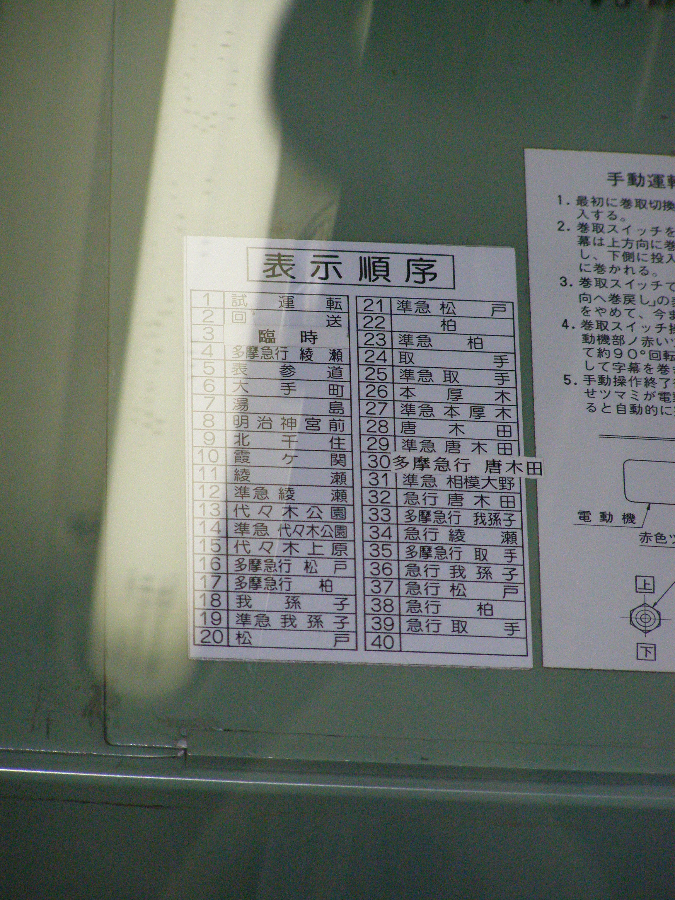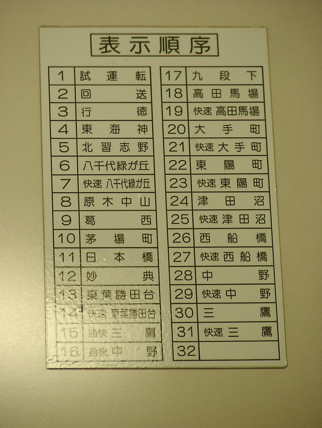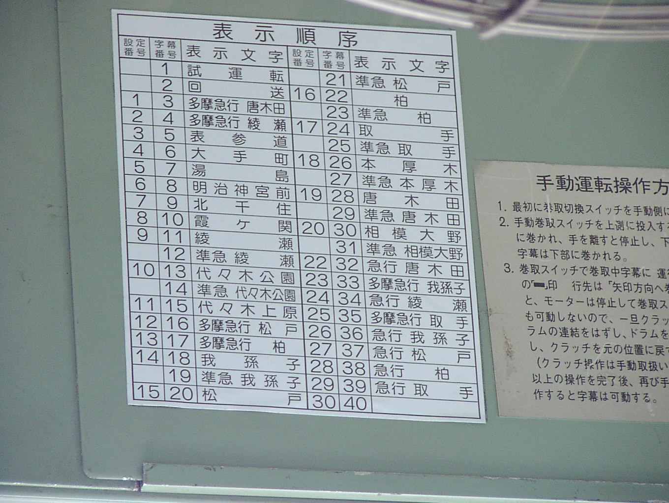 旧営団は、幕車に限り各々の前面表示機の蓋に貼付されています。 LED車には対照表は存在しません。